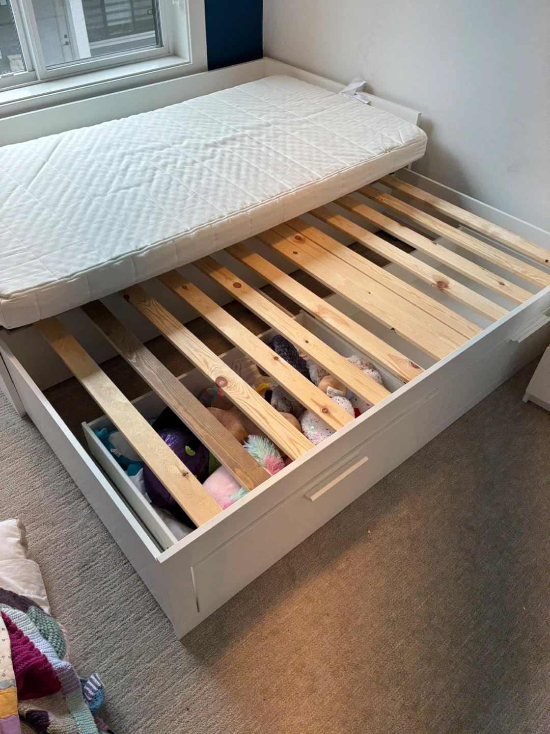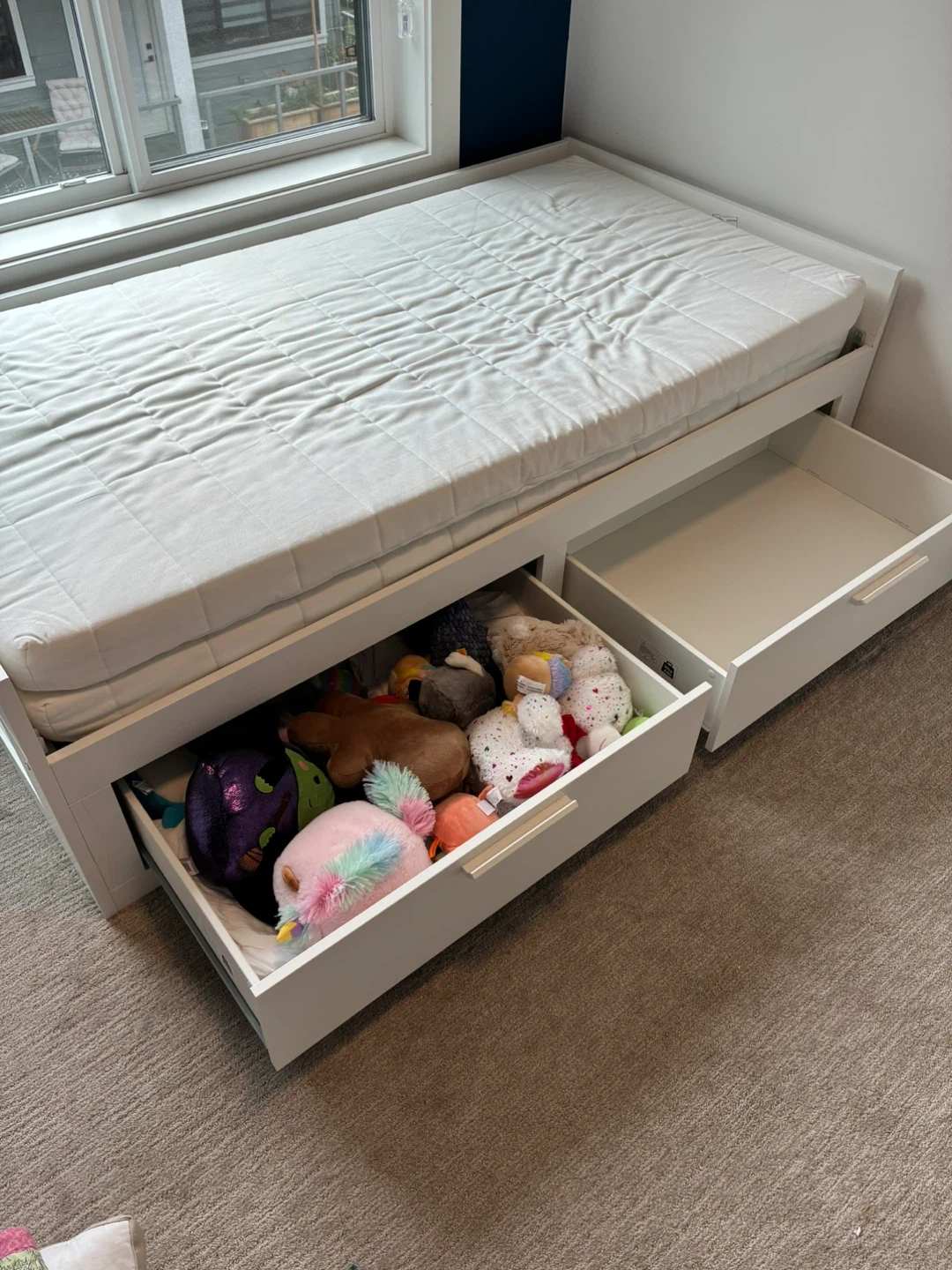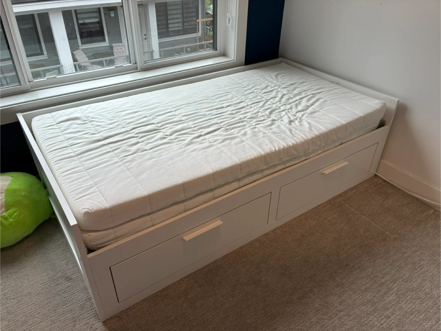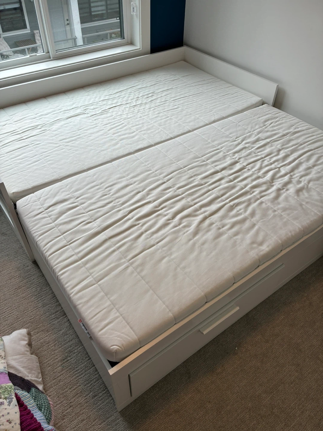 Selling a day bed with a pull-out trundle in great condition! Perfect for a guest room or kids' room. The bed frame is white and comes with the trundle for extra sleeping space. Two large storage drawers are great for linens or stuffies. Two mattresses included! Stack the mattresses for the single bed or separate out for King Sized bed when trundle is pulled out. https://www.ikea.com/ca/en/p/brimnes-daybed-frame-with-2-drawers-white-40228708/