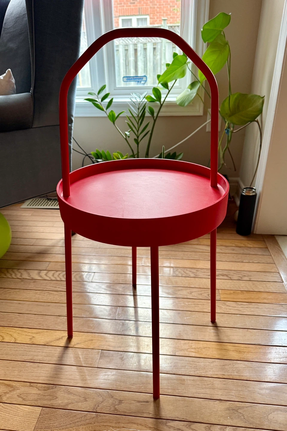 76Selling a red IKEA Burvik side table! This handy little table is perfect for small spaces and can be easily moved around thanks to its convenient handle. It's in great condition and ready for a new home!