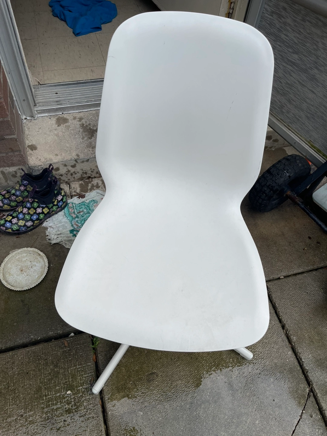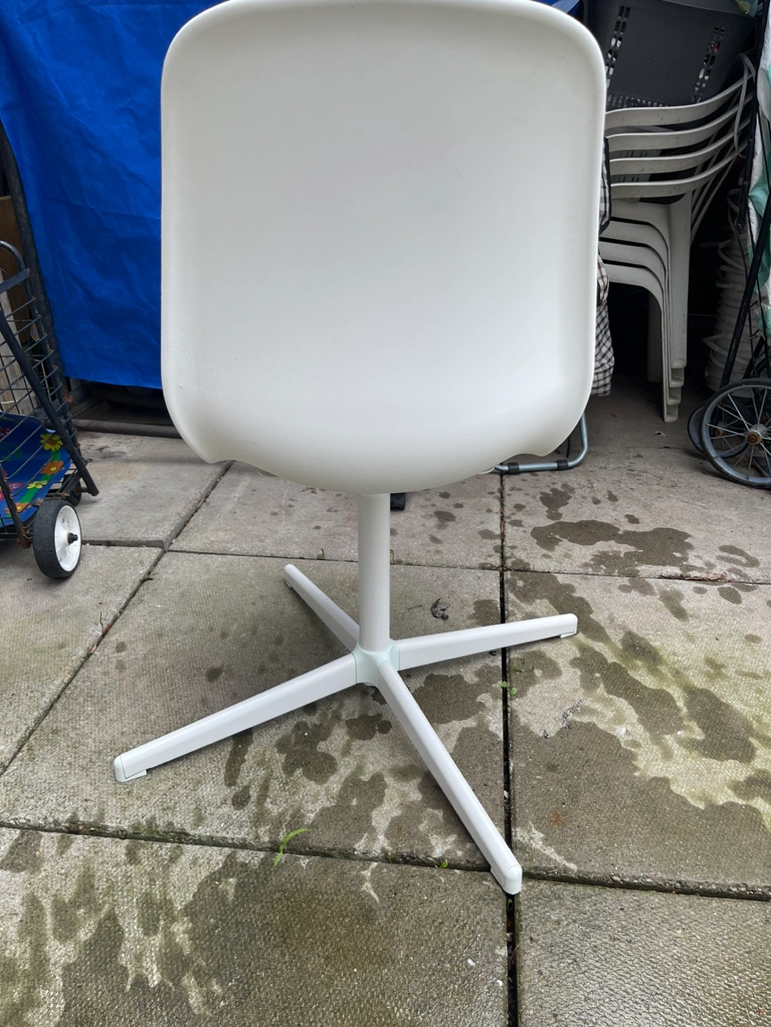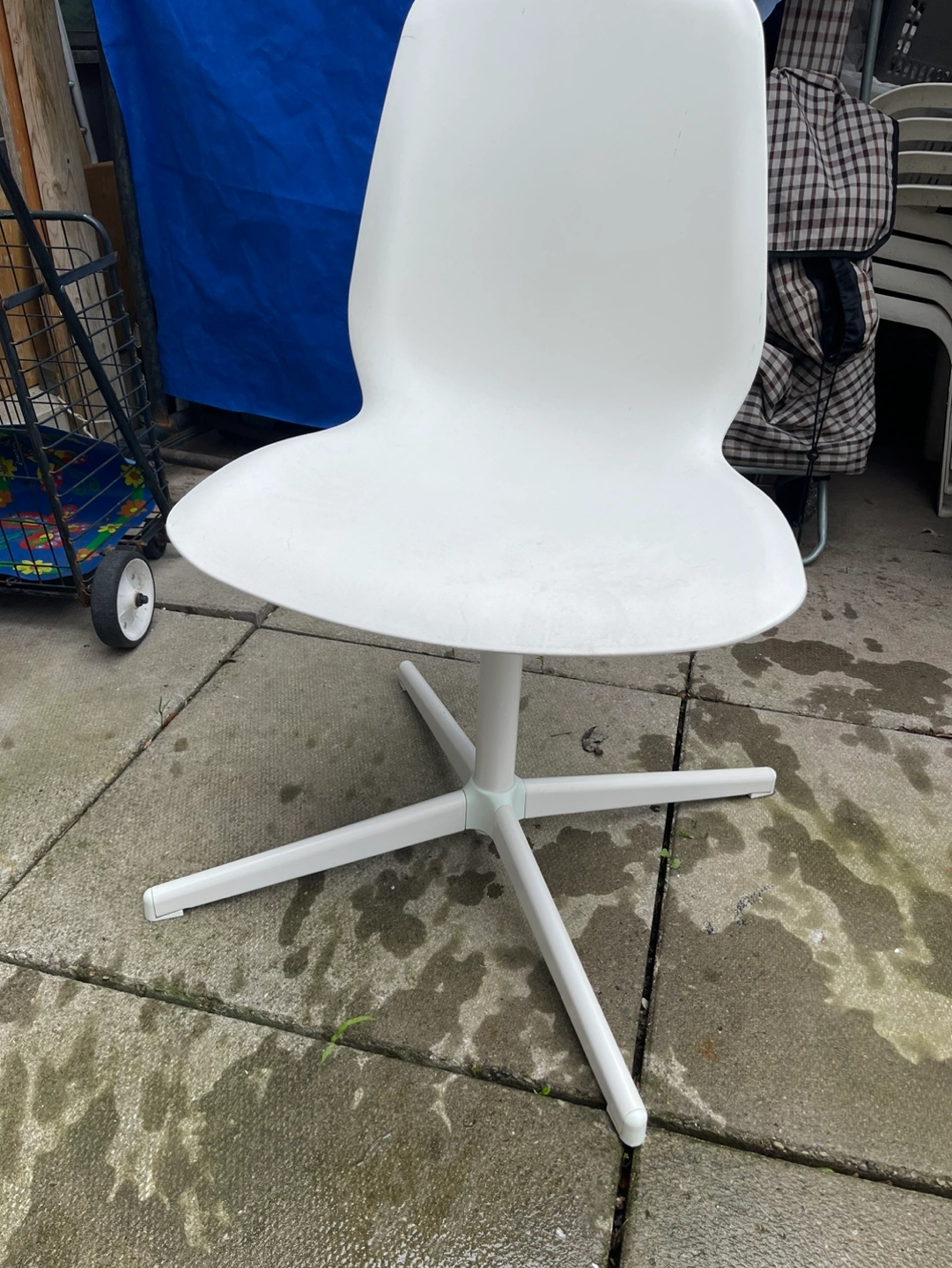 In great condition white chair. It can spin around (the top part can rotate around) but does not have wheels. The seat has some stains but can be cleaned up with a special cleaner. Please check photos.
