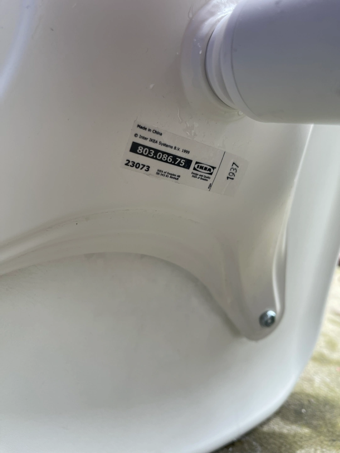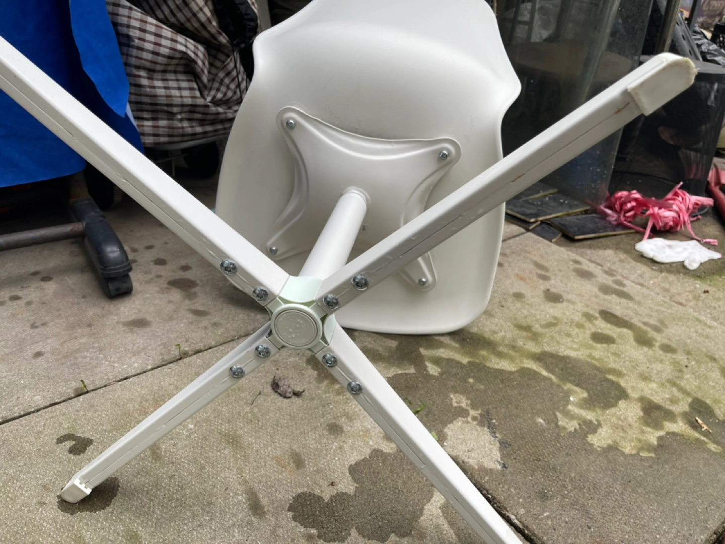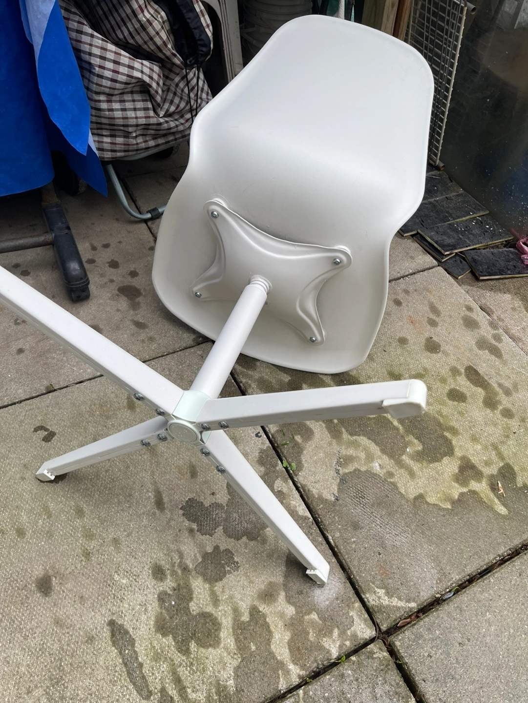 In great condition white chair. It can spin around (the top part can rotate around) but does not have wheels. The seat has some stains but can be cleaned up with a special cleaner. Please check photos.
