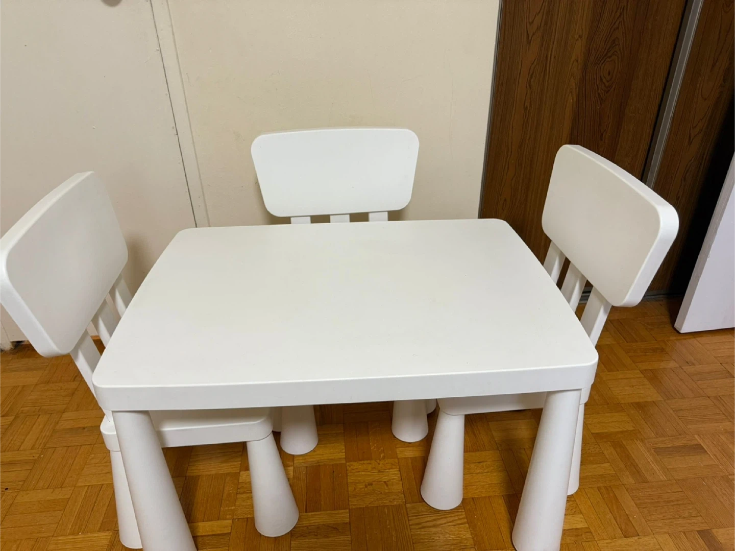 14Selling a cute little table and chairs set for kids! It's in great shape and perfect for arts and crafts, snack time, or just hanging out. The set includes a table and three chairs, all in a clean, white finish. It's sturdy and easy to clean, making it ideal for young children