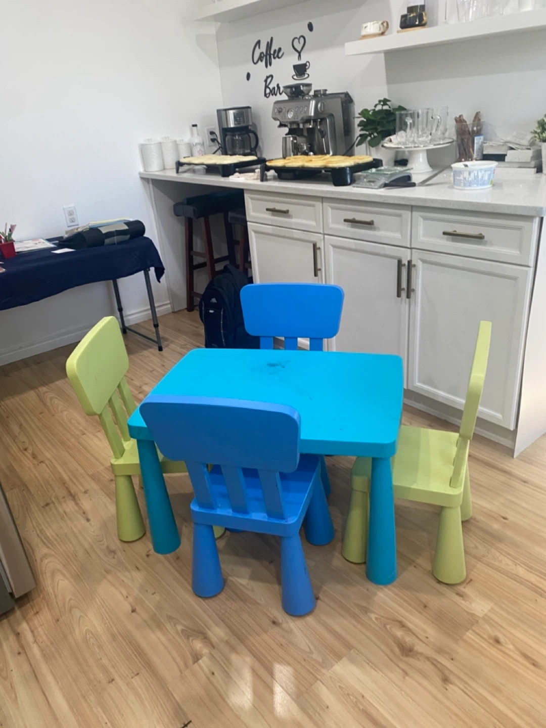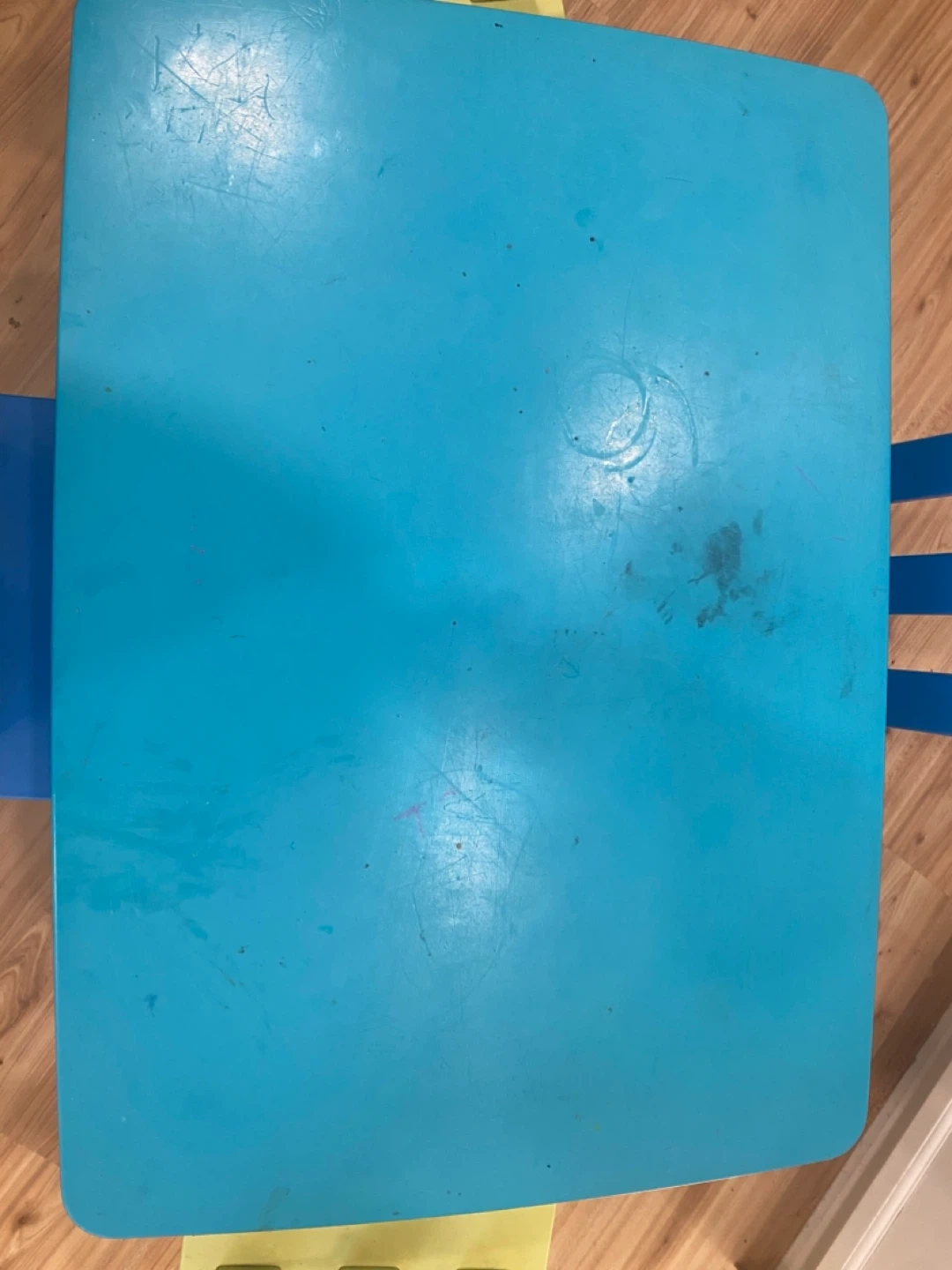 42Selling a kids' table and four chairs. The table is blue and the chairs are a mix of blue and green. Perfect for arts and crafts or snack time for the little ones! Some paint and markers marks in table. Ready for a new home.