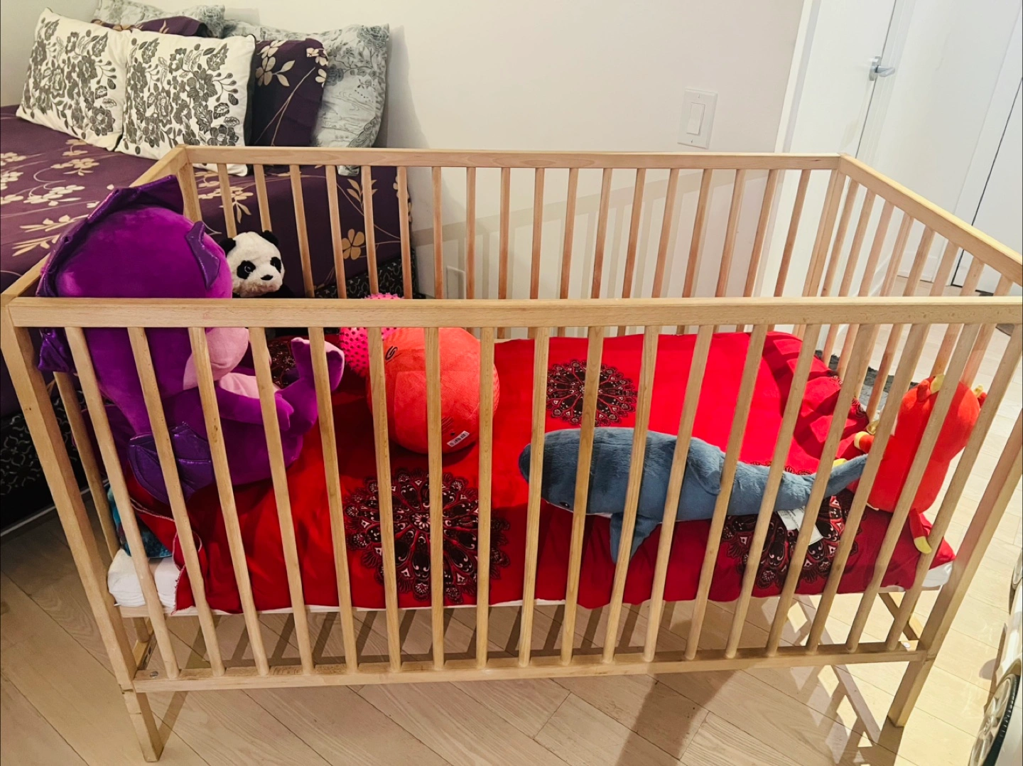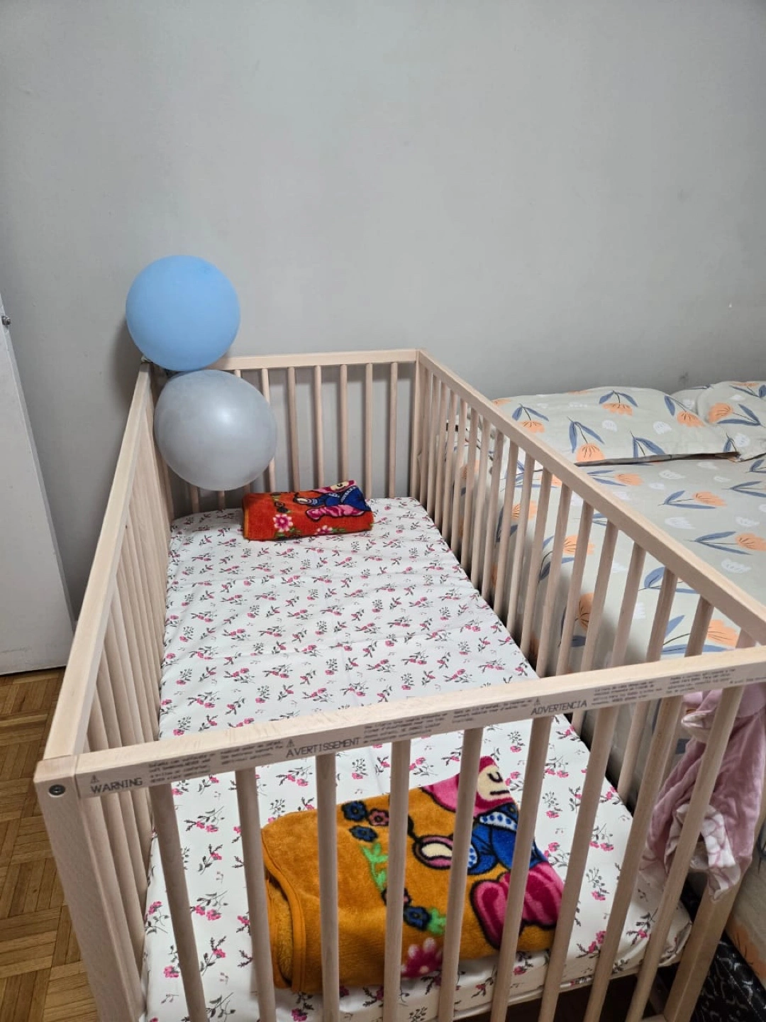 Wooden crib, light colour. Minimalist design. Good condition. Smoke free and pet free home. Mattress is available for free.