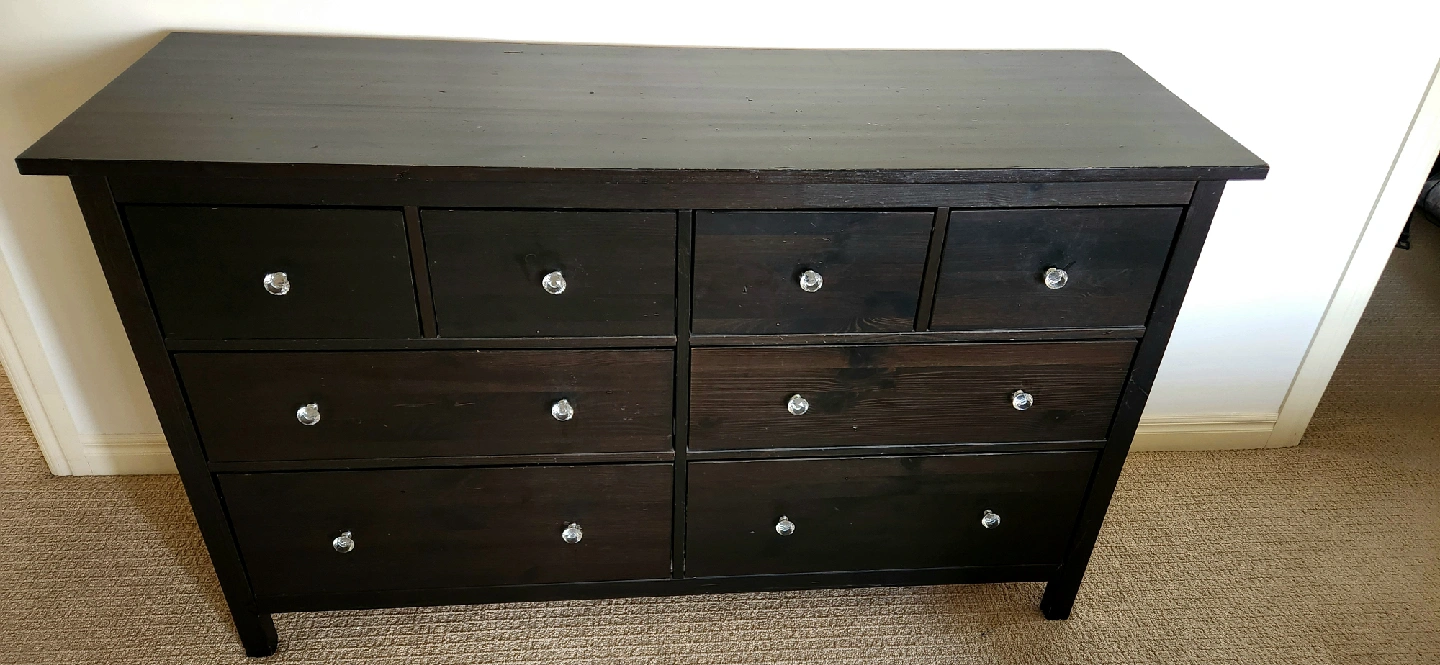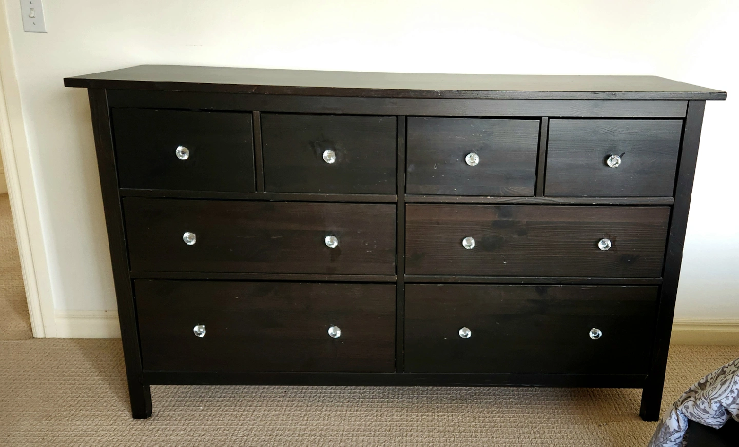 A lovely dark brown dresser with eight drawers, each accented with crystal knobs! It's a stylish piece that would look great in any bedroom or living space. The dresser is in good condition but it has some scratches, the drawers they work good.(Moving sale)