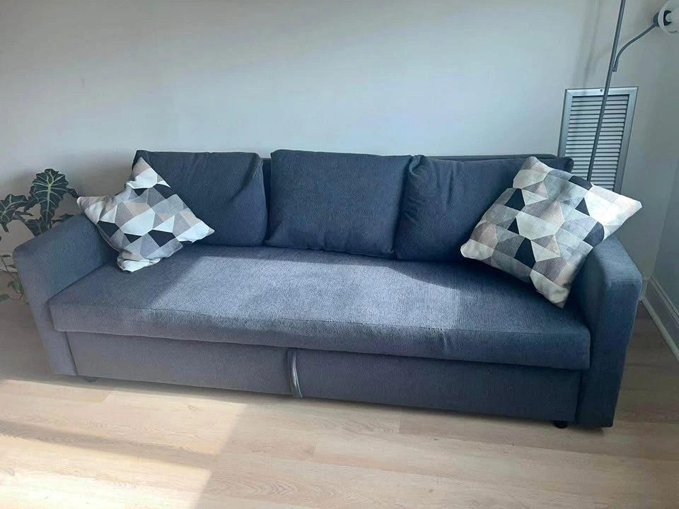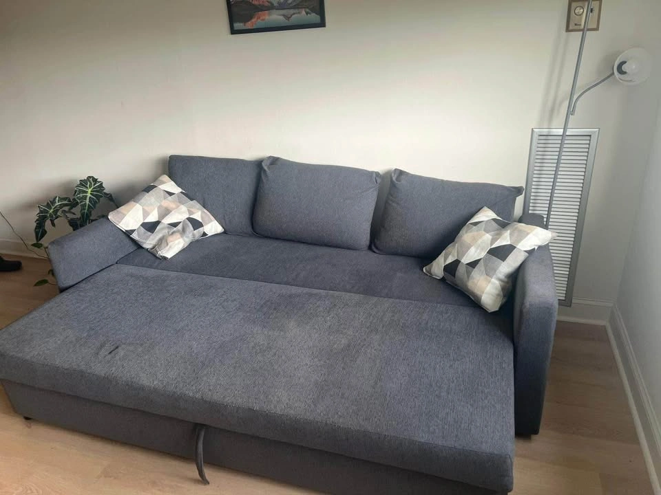 Modern and functional sofa bed in dark grey fabric. Perfect for apartments, condos, or guest rooms. Converts easily into a full bed for overnight guests. Measurements (Sofa): • Width: 225 cm (88 5/8”) • Depth: 105 cm (41 3/8”) • Height: 83 cm (32 5/8”) • Seat depth: 61 cm (24”) • Seat height: 46 cm (18 1/8”) Bed size when unfolded: • Width: 144 cm (56 3/4”) • Length: 199 cm (78 3/8”) Features: • Easy pull-out bed mechanism • Comfortable cushions included • Neutral dark grey upholstery matches any décor • Sturdy construction and well-maintained Pickup in Etobicoke Asking price: $750