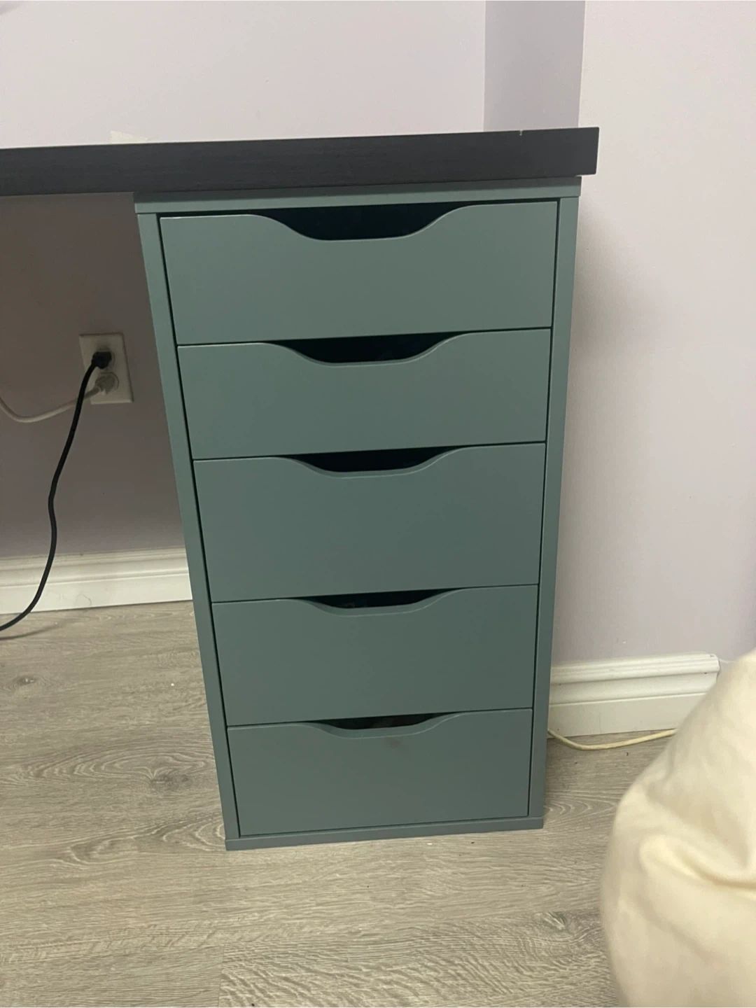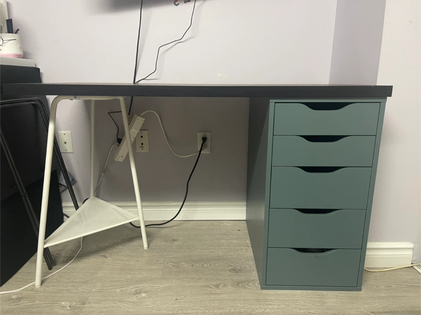 10Looking to sell my IKEA desk setup! It features a sleek black desk top paired with an Alex drawer unit in a lovely green-grey colour. The trestle is the TILLSLAG model in white metal. It's a great combo for a home office or study space
