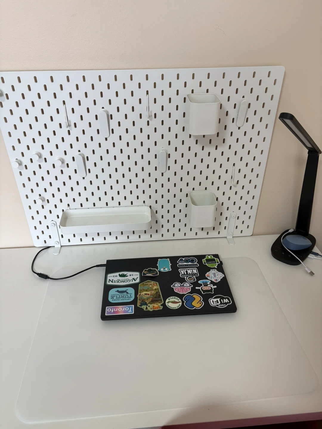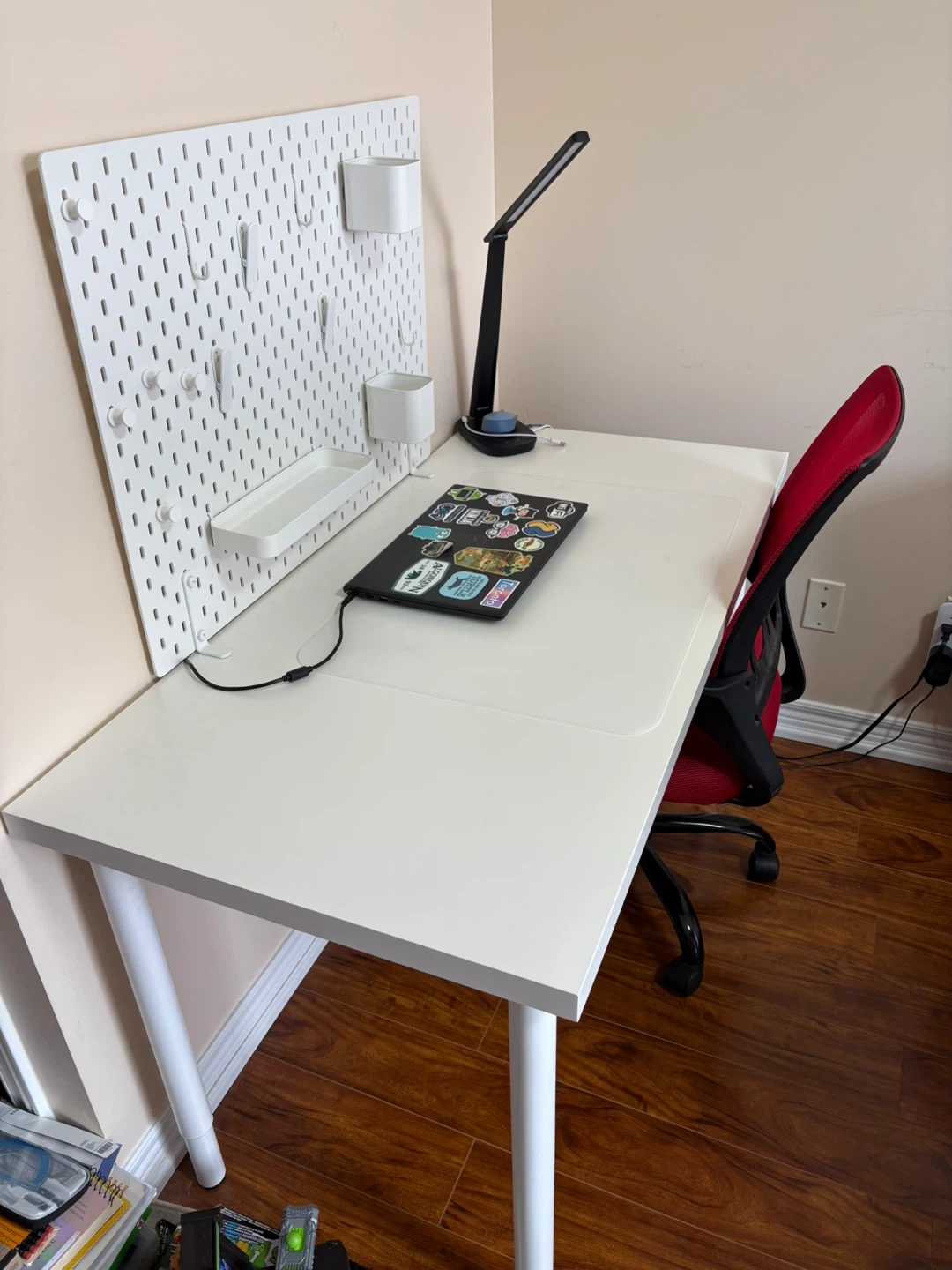 Selling an IKEA Desk and Skadis pegboard with some accessories. It's great for organizing your desk or workspace! The pegboard is in good condition and comes with the pictured accessories. If you want you can get a free chair that pictured