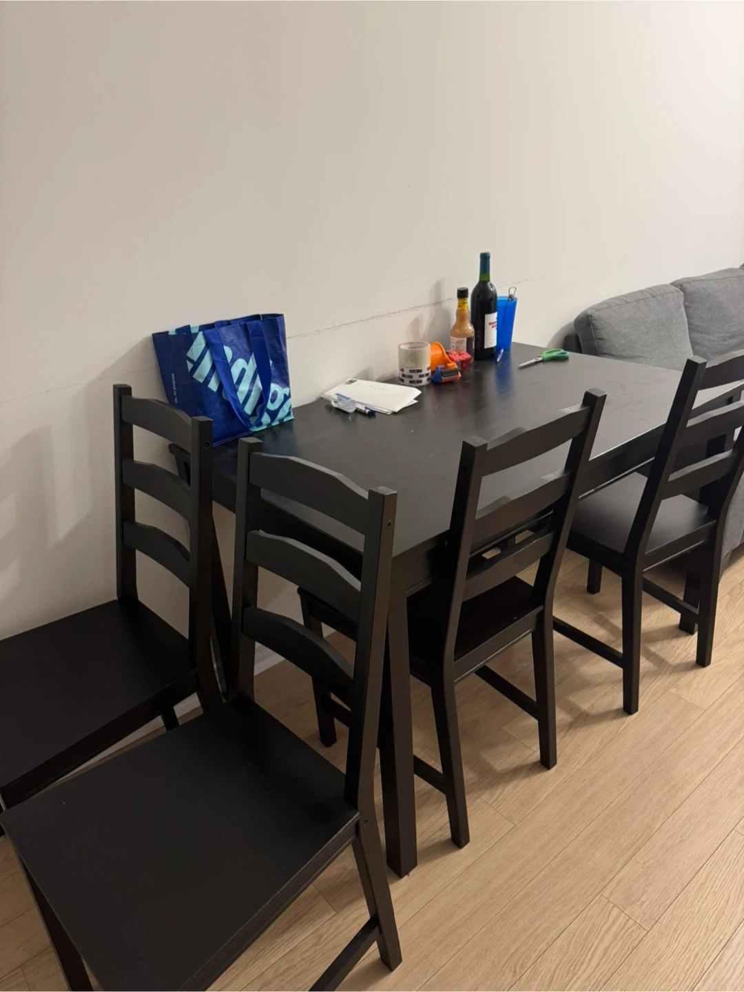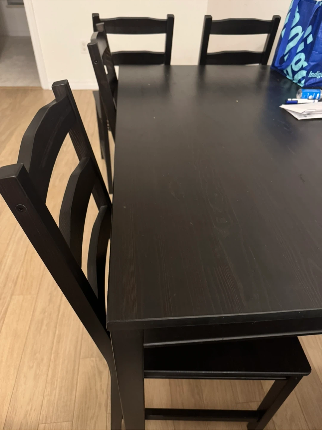 23Selling a used Ikea dining table with chairs. The set is in good condition and has a classic black finish. Perfect for a small dining area or kitchen! Added by one medium-sized coffee table with dark wood finishing!