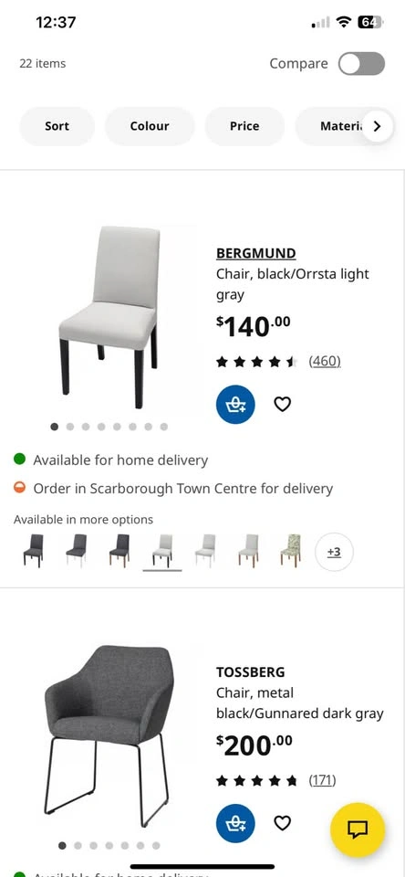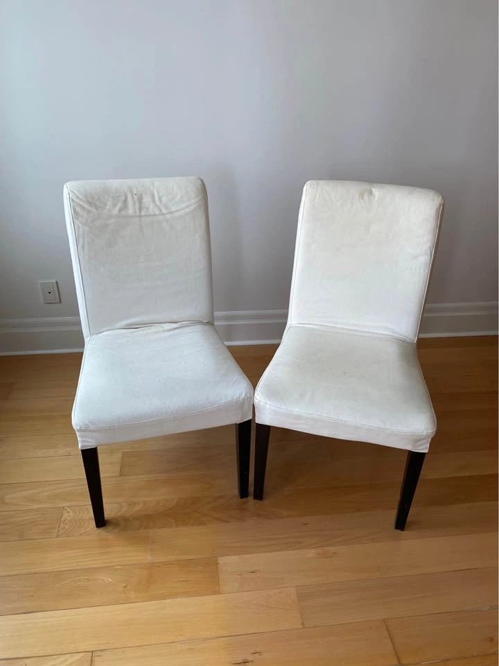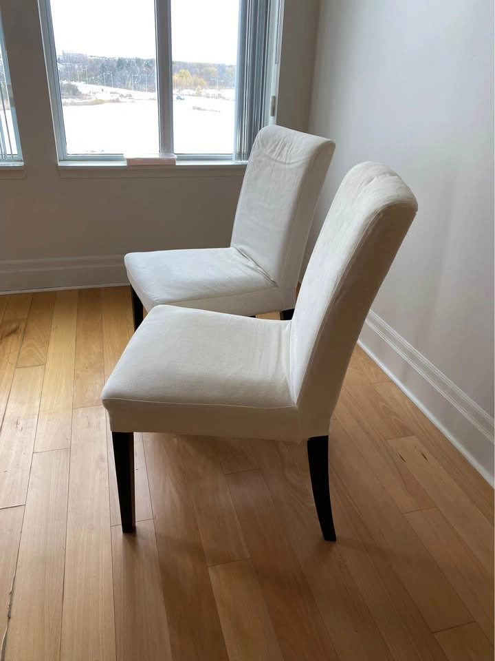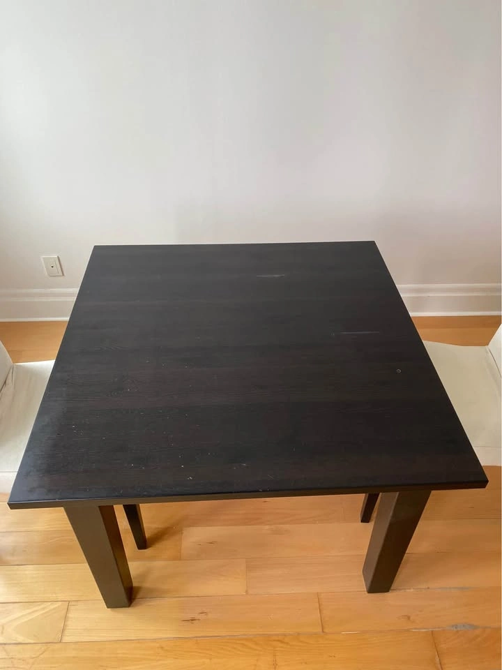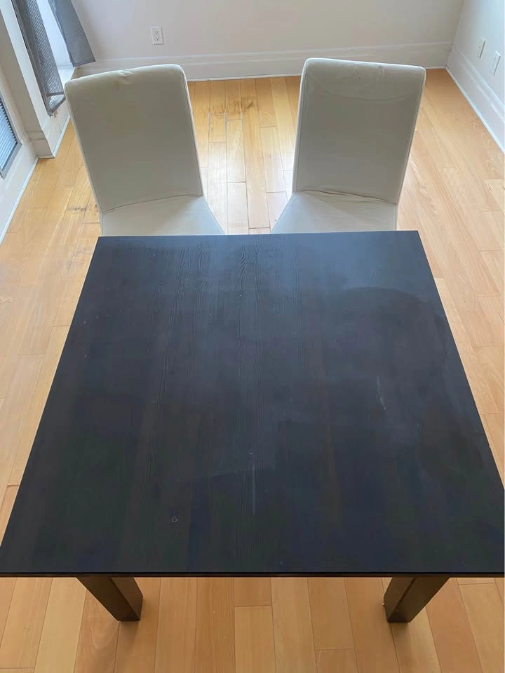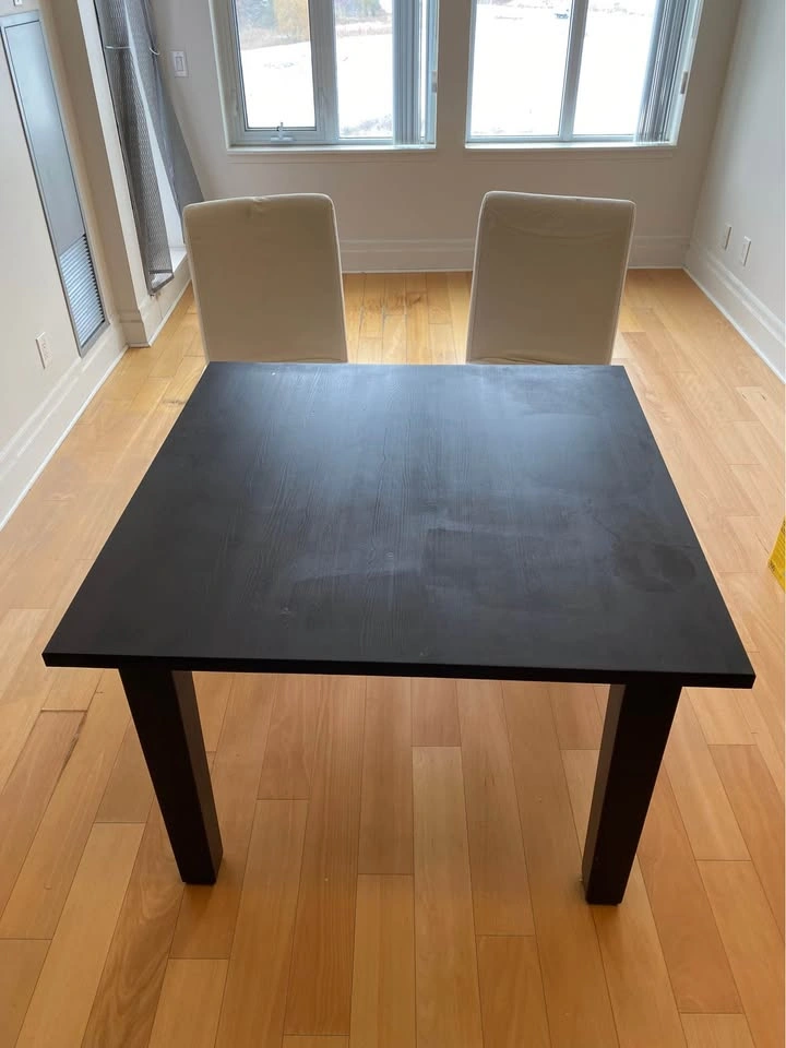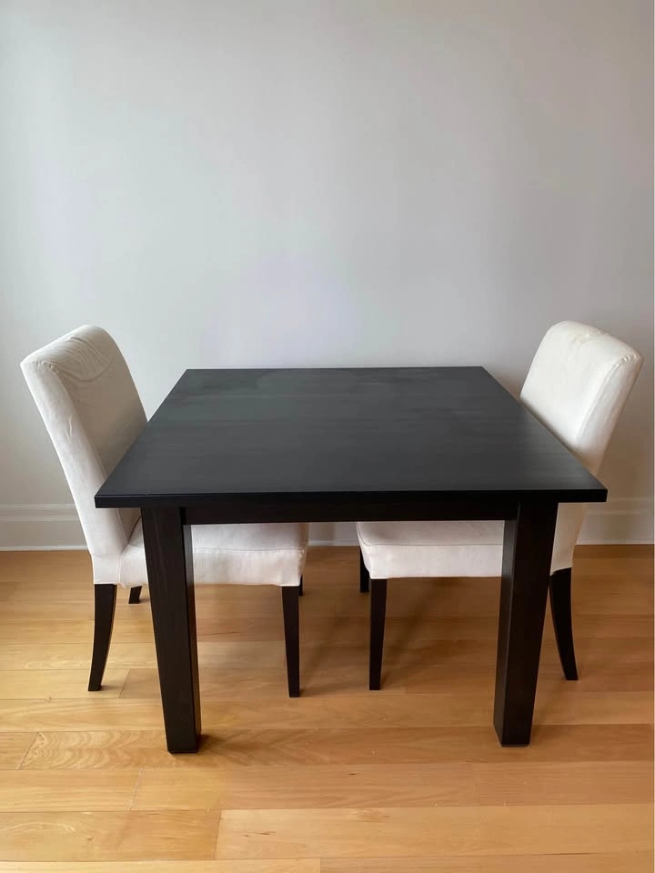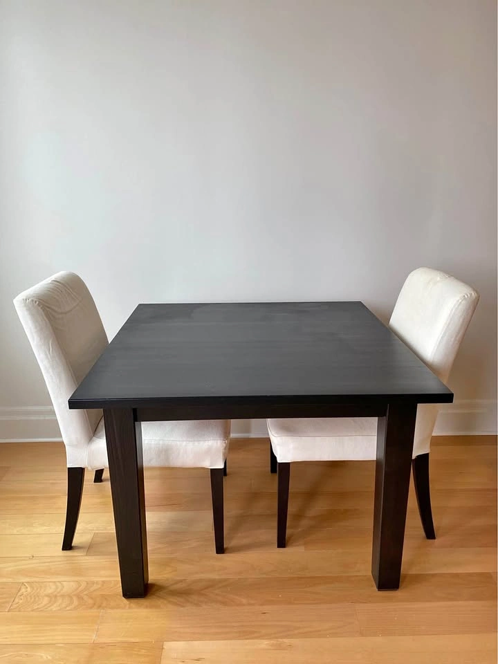 66This is an IKEA STORNAS wood dining table, accompanied by two BERGMUND chairs. It’s perfect for a small dining area. The set has been lightly used, so it has some signs of wear but is still in excellent condition for everyday use. Table Dimensions: 105cm long X 105cm width X 74cm height Chair Material: Fabric with wooden legs Colour: Dark brown table with cream chairs This dining set is waiting for its new home. If the ad is up, it's available—no need to ask! Looking forward to finding a great owner for this set!