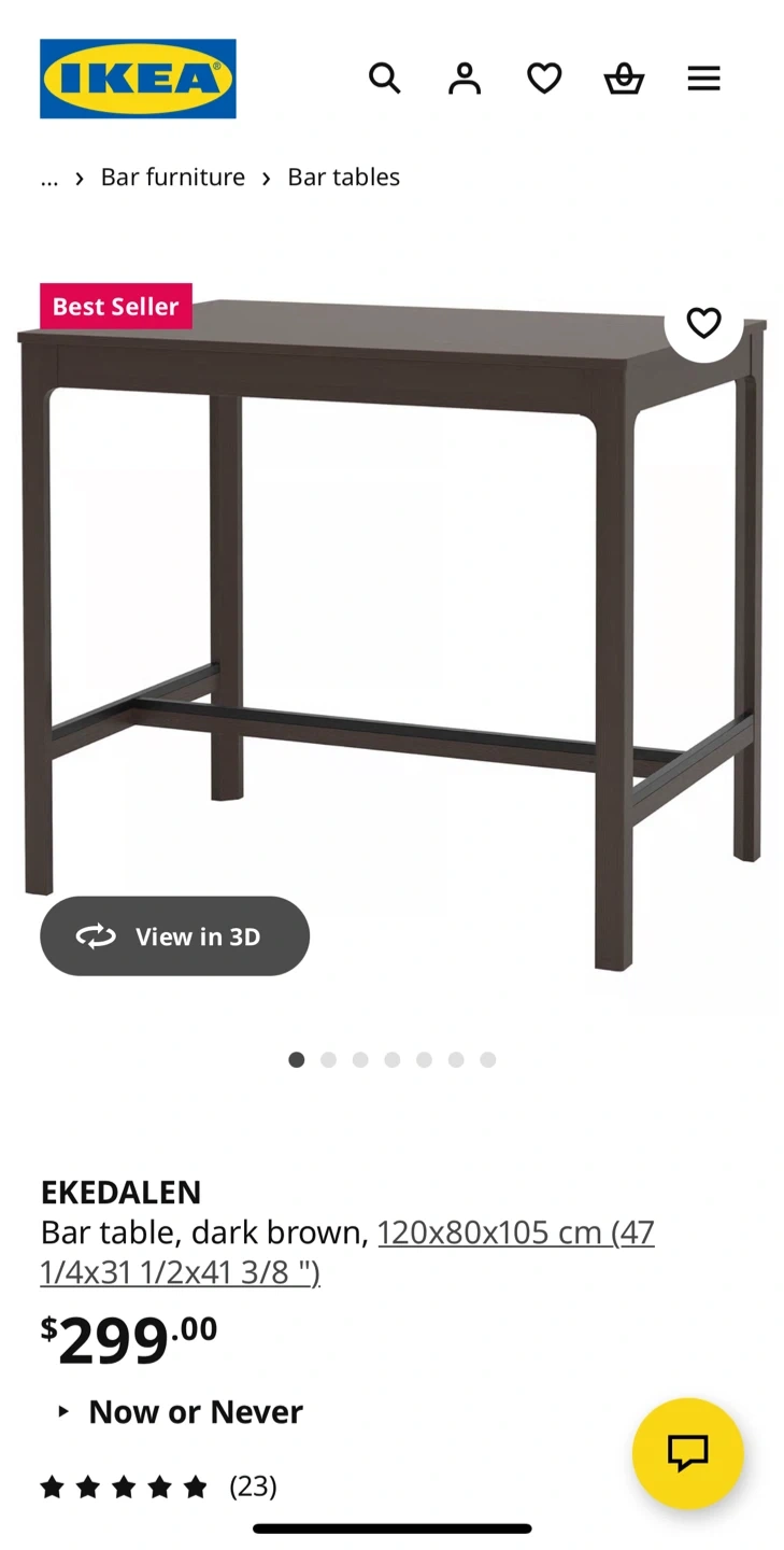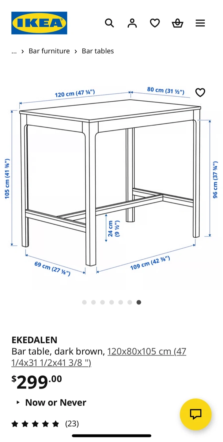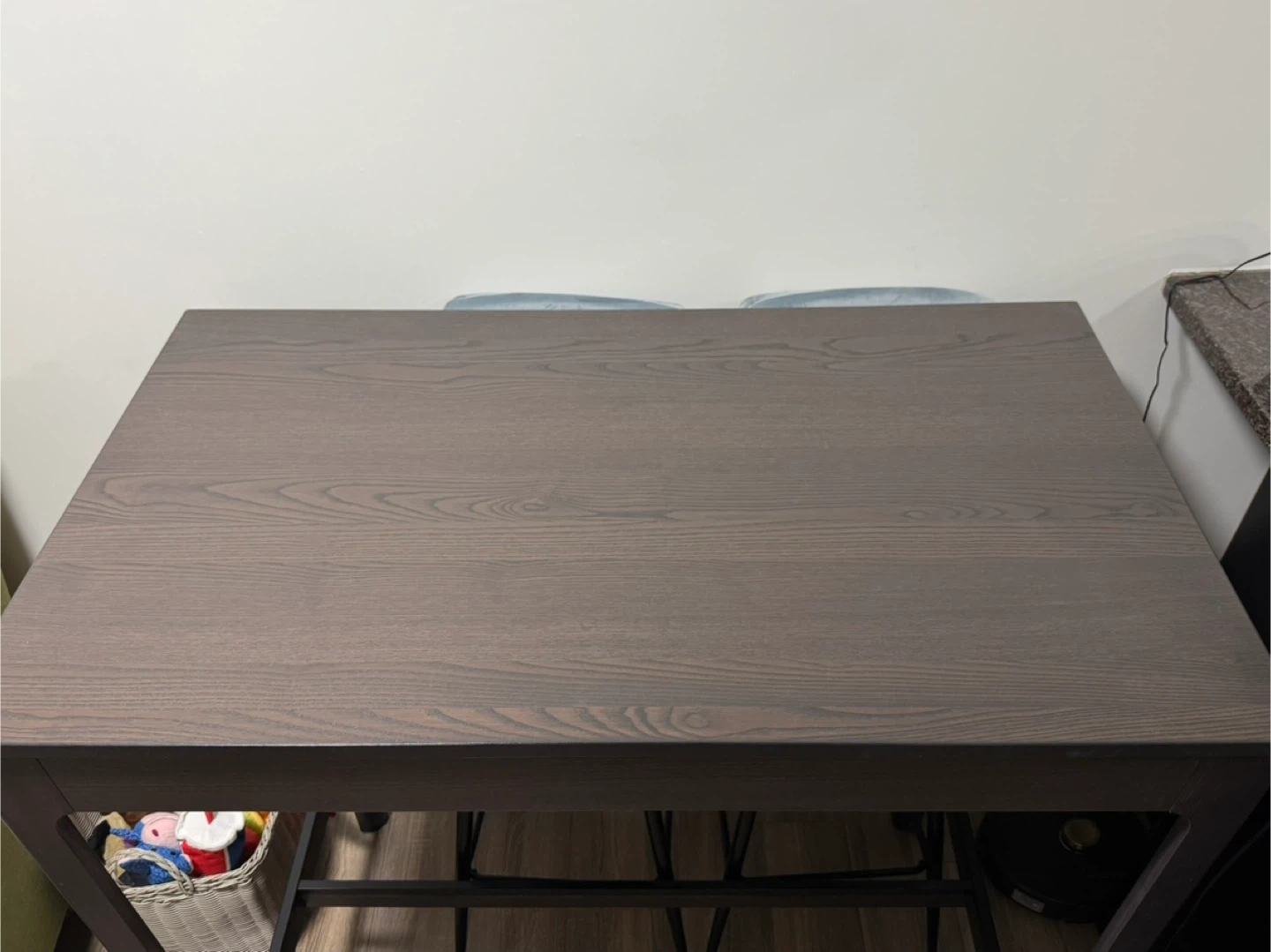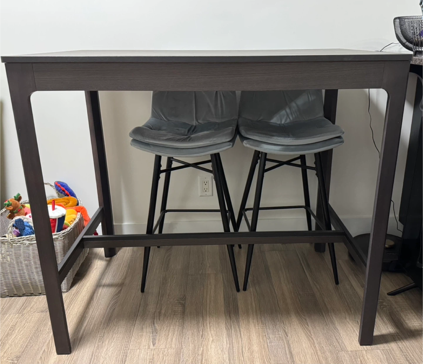 5Selling an IKEA Ekedalen bar table with a bar stool. The table is dark brown and measures 120x80x105 cm (47 1/4x31 1/2x41 3/8 "). The bar stool is a light grey colour with black legs. Great for a kitchen or dining area! IKEA Ekedalen bar height table $150 Chairs - $25 each. Must take in pairs. Table will be disassembled for pick up 11/18 in the evening. No marks or scratches on the table, chairs have barely been used. All dimensions are in the pictures Must be gone by weekend, make me an offer. Willing to sell table and chairs separately. Will not reply to “is this available”, ad will be edited as items sell.