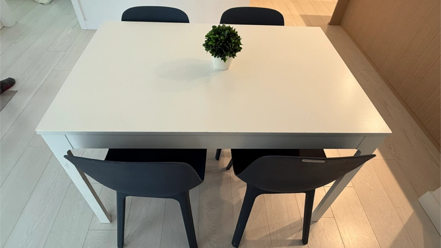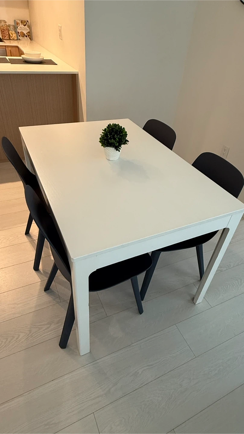 Selling an IKEA Ekedalen extendable dining table with four Odger chairs (navy) ! The table comfortably seats four but can be extended to accommodate more guests. The table dimensions are 120/180x80 cm (47 1/4/70 7/8x31 1/2 "). The chairs are anthracite in colour and retail for $92 each.