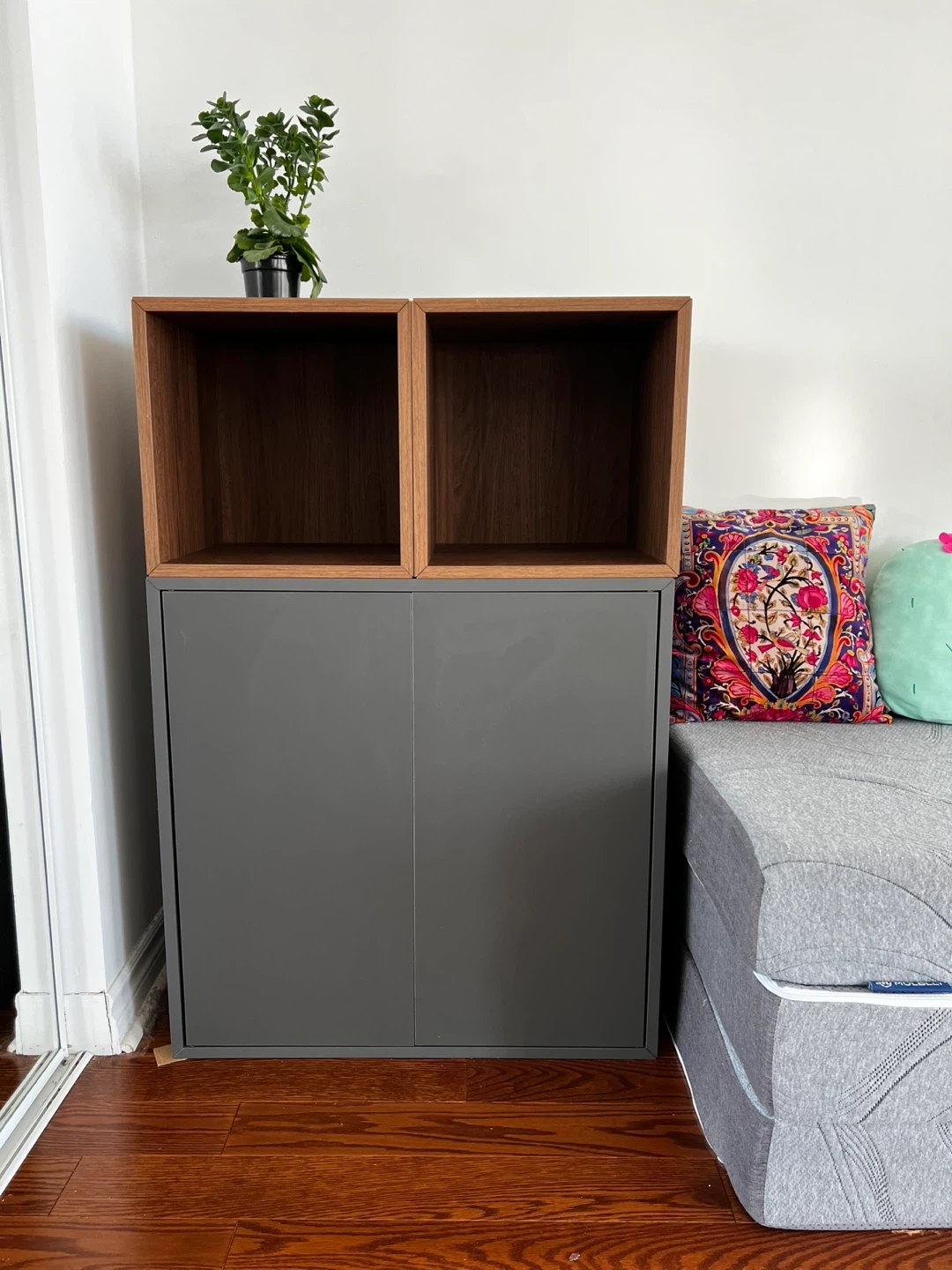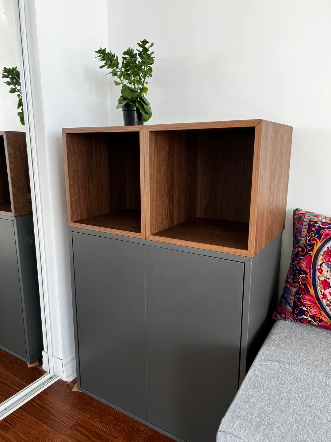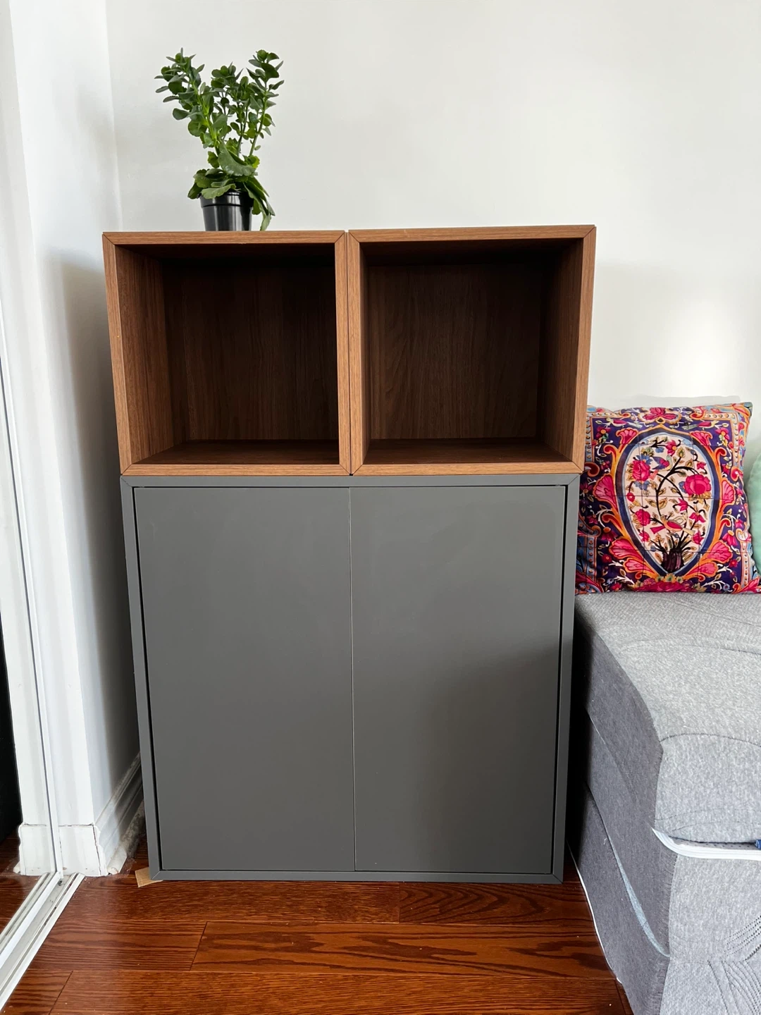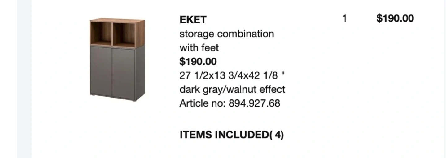 22Looking to sell my IKEA EKET storage combination! It's in great shape and features a stylish dark grey and walnut effect. Dimensions are 27 1/2x13 3/4x42 1/8 ". Article no: 894.927.68 Originally bought for $190