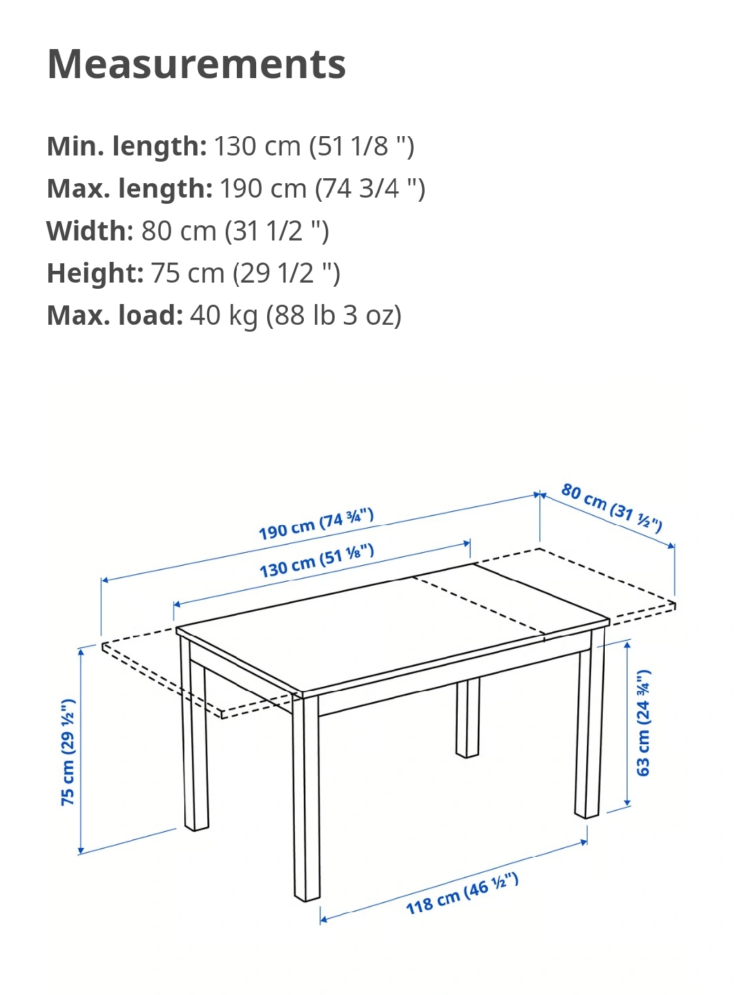 352Selling a white IKEA extendable dining table. Retail $279 +tax Includes a bench that was purchased separately Measurements: - Minimum length: 130 cm (51 1/8 ") - Maximum length: 190 cm (74 3/4 ") - Width: 80 cm (31 1/2 ") - Height: 75 cm (29 1/2 ") - Max load: 40 kg (88 lb 3 oz)