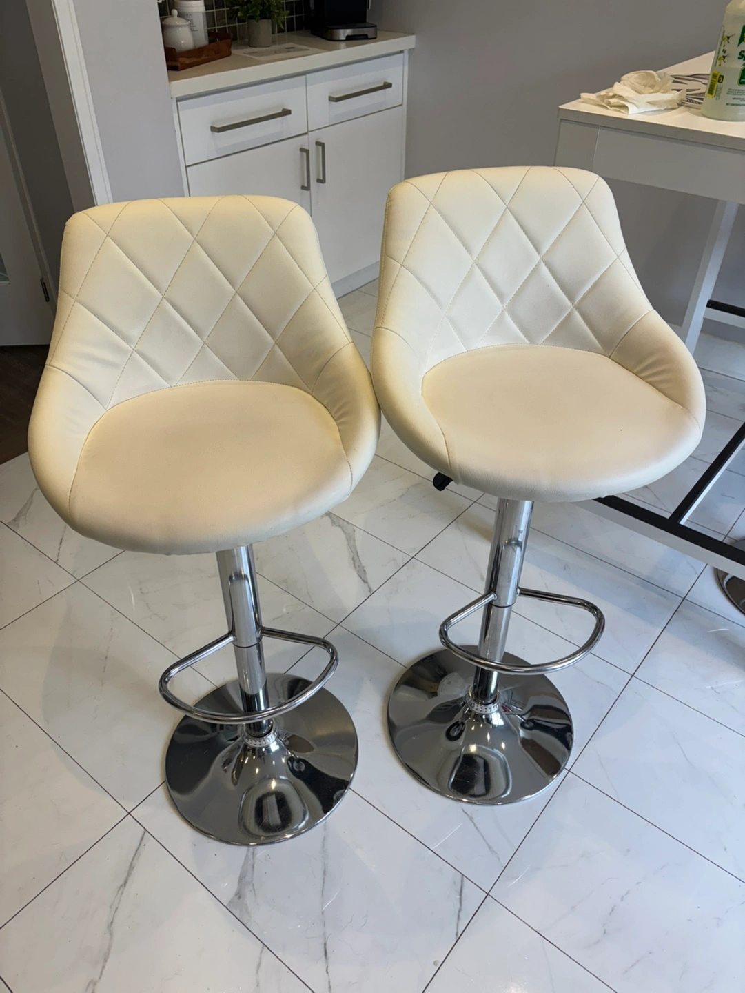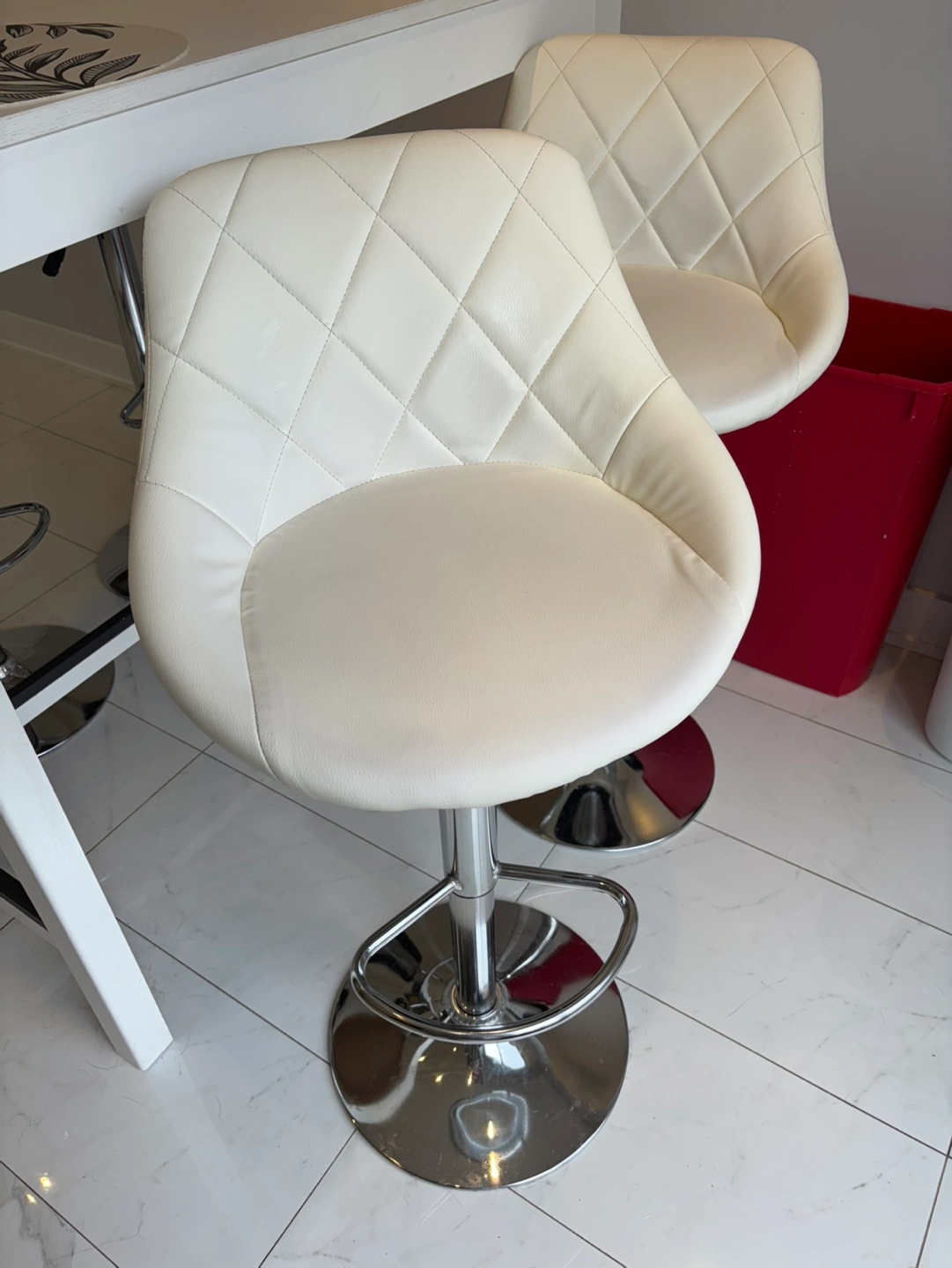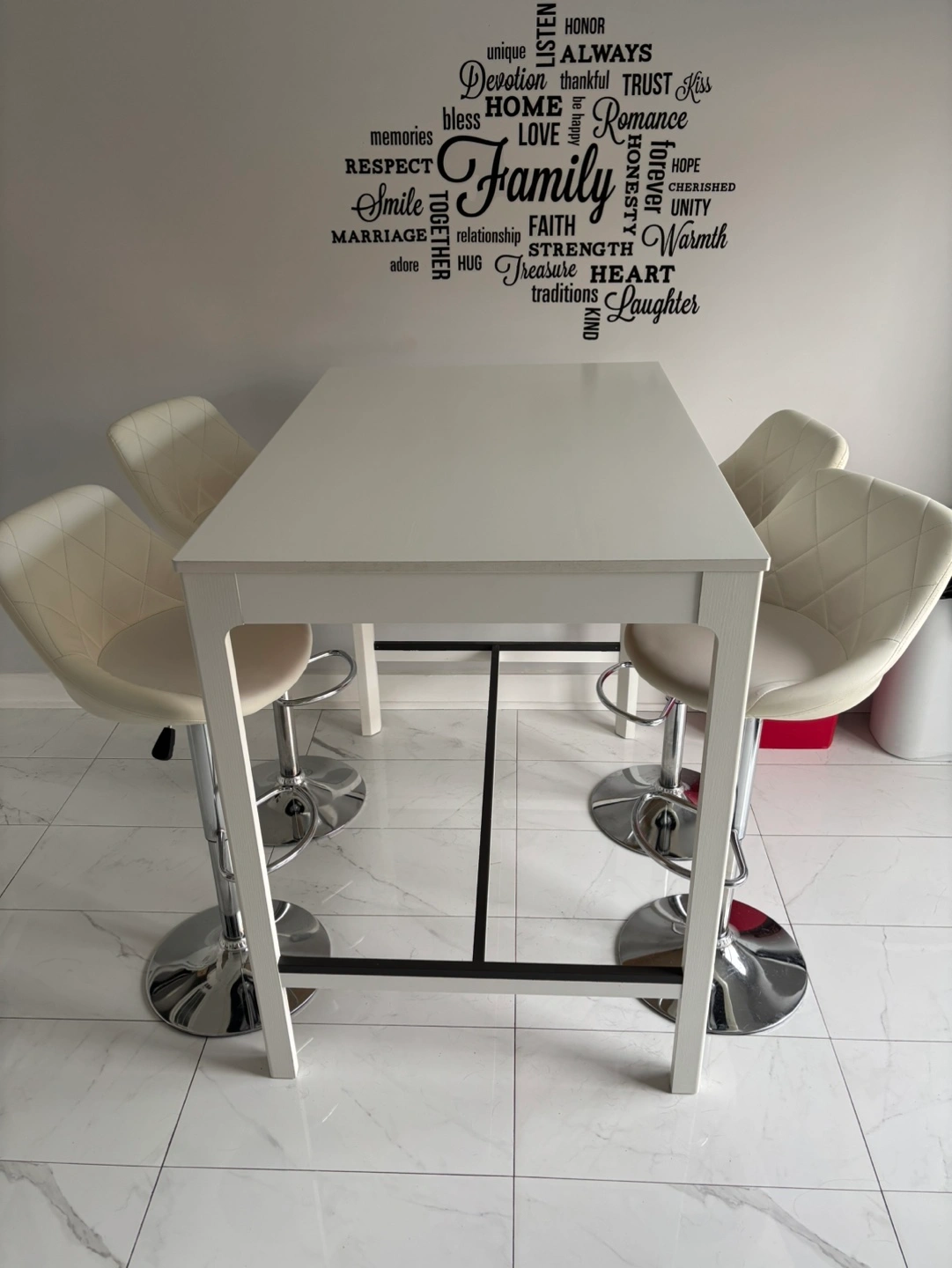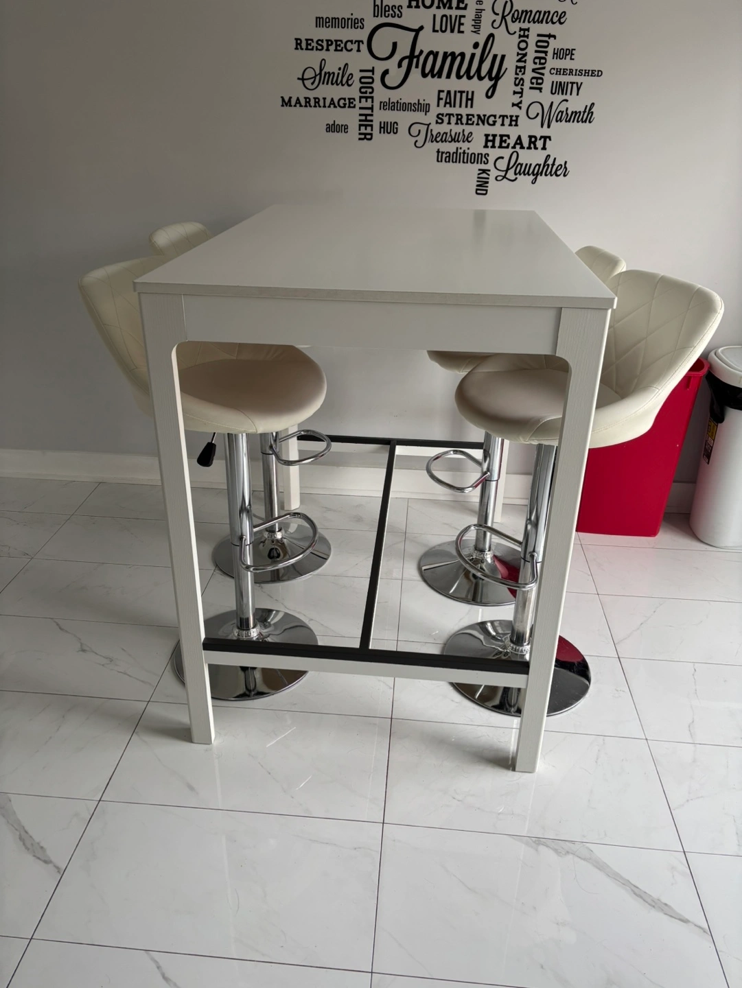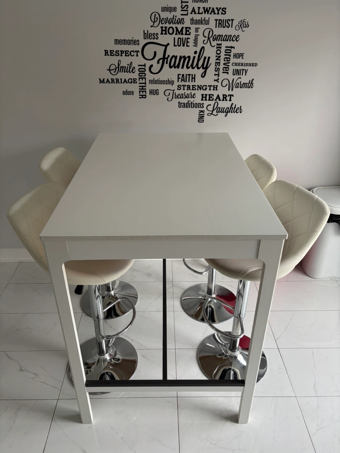 10Set includes white bar table and four matching stools. Chrome-base stools feature padded off-white seats. Table is rectangular with simple design. Great for kitchen or small space.