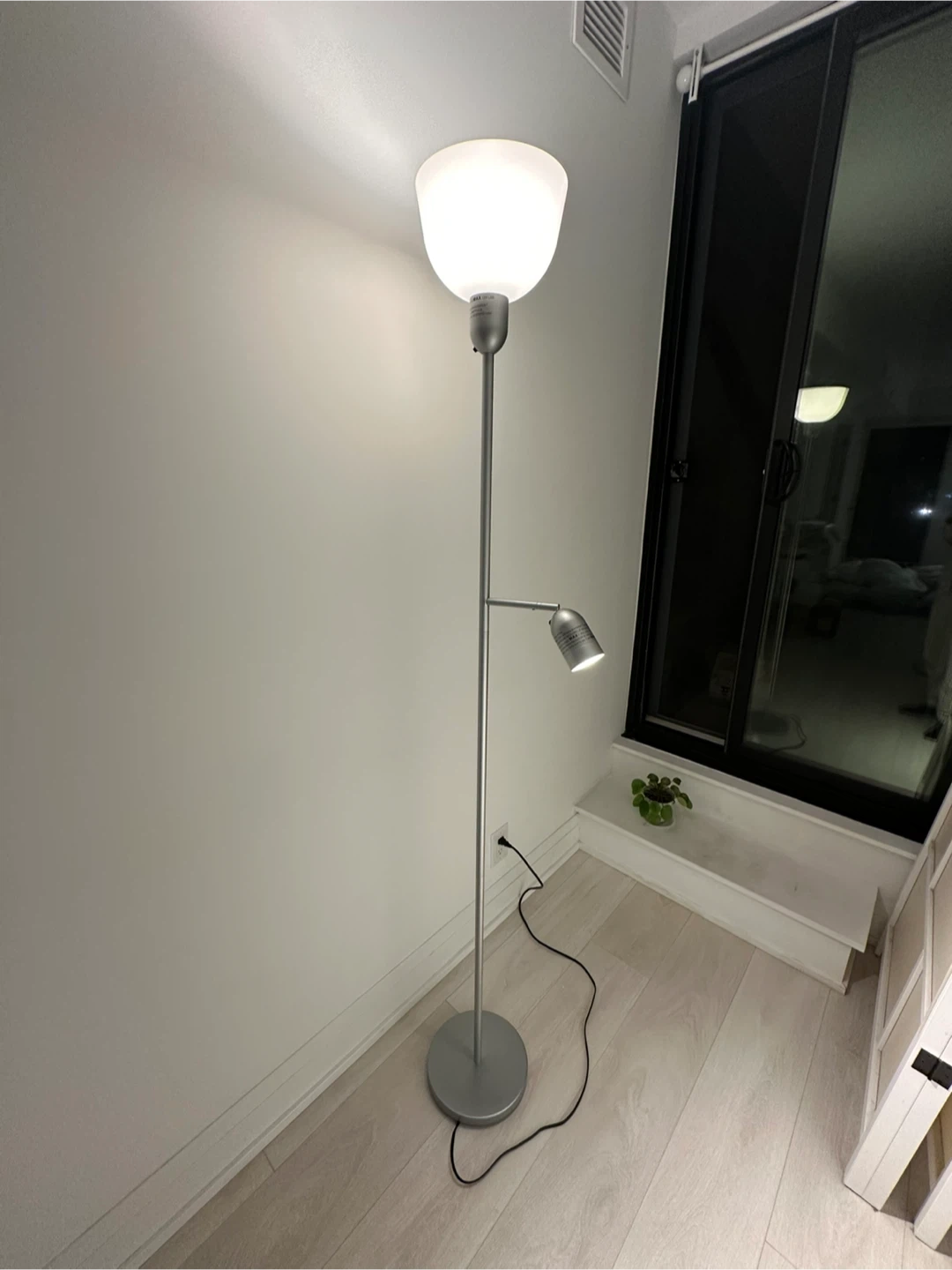 15Selling an IKEA floor uplight/reading lamp in great condition! This lamp provides both ambient and focused lighting, perfect for any room. It's a stylish and functional addition to your home decor Spare bulb included.