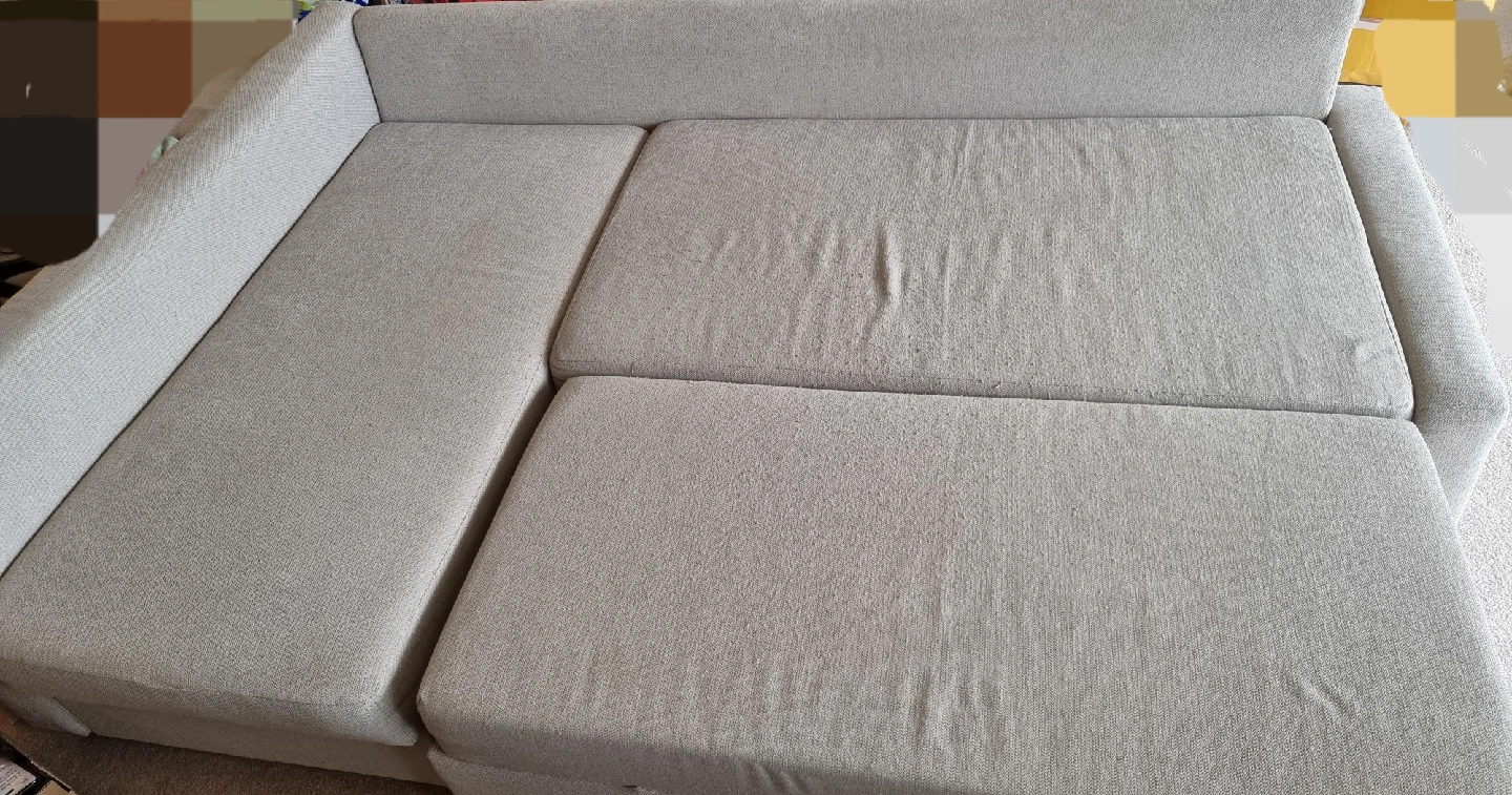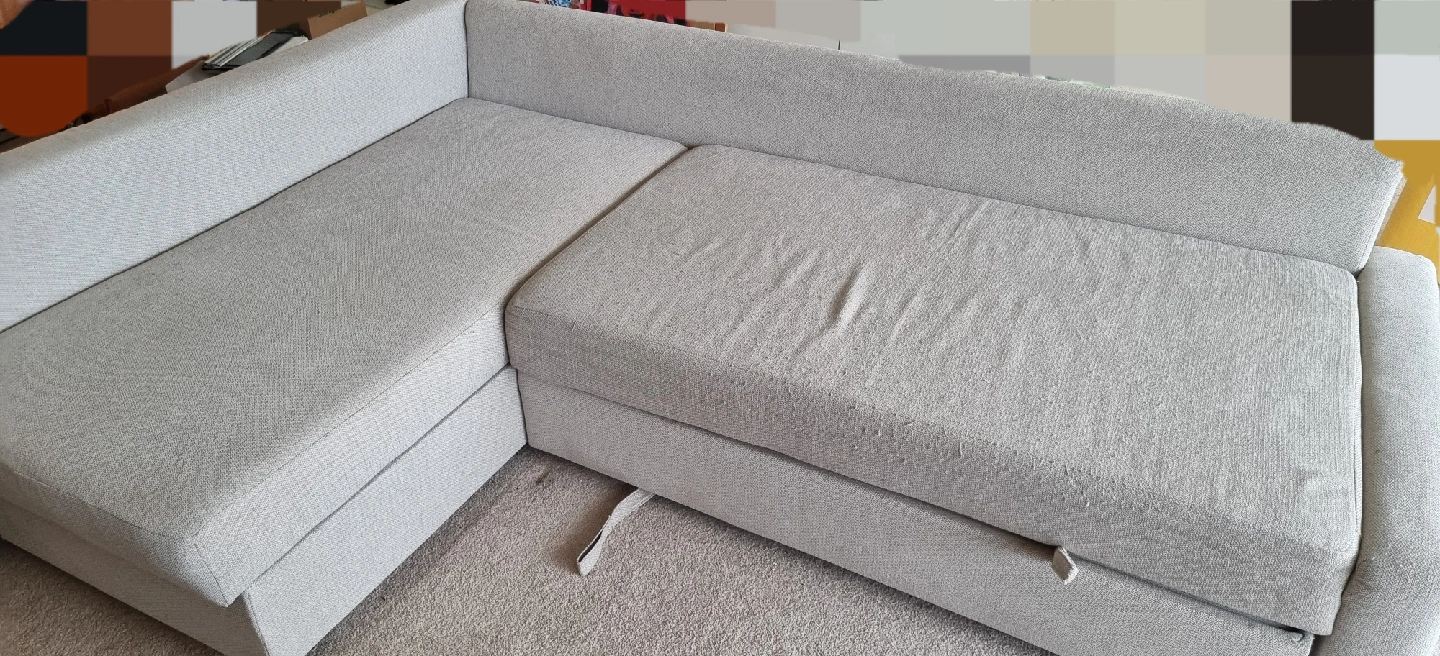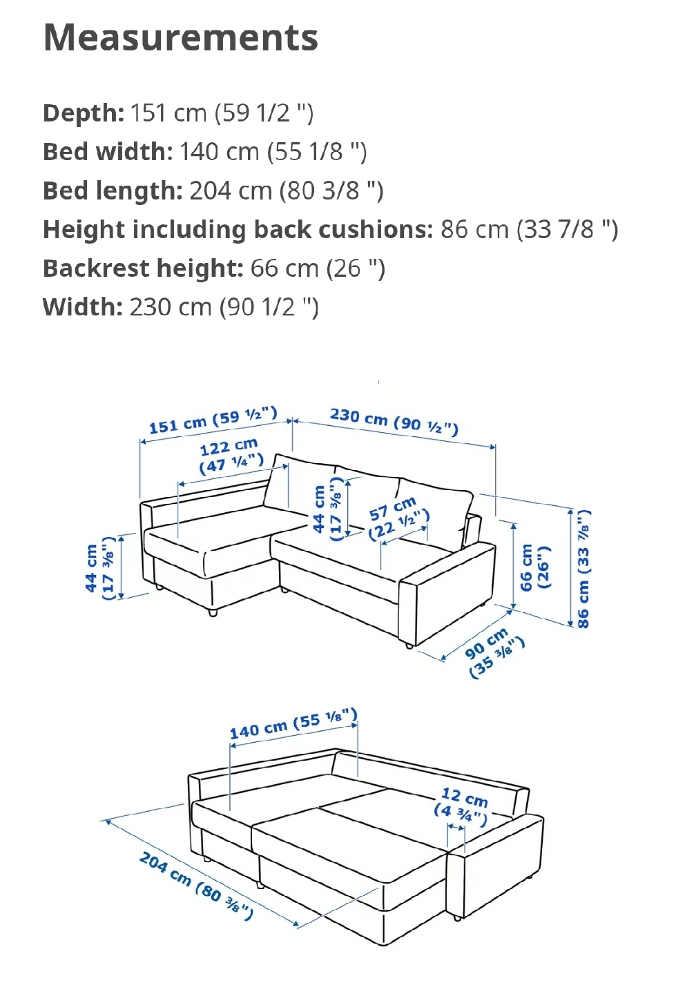 Selling a convertible sectional sofa bed in a light grey colour. This comfy sofa can easily transform into a bed. Measurements: - Depth: 151 cm (59 1/2 ") - Bed width: 140 cm (55 1/8 ") - Bed length: 204 cm (80 3/8 ") - Height including back cushions: 86 cm (33 7/8 ") - Backrest height: 66 cm (26 ") - Width: 230 cm (90 1/2 ")