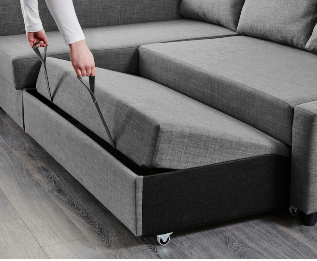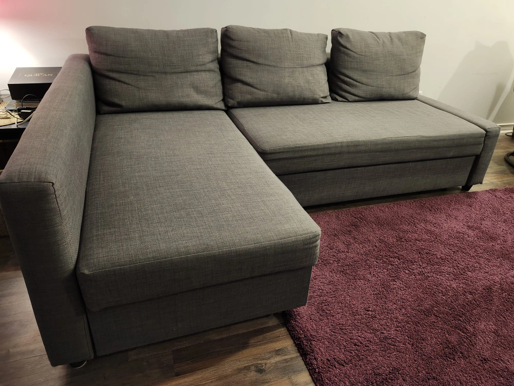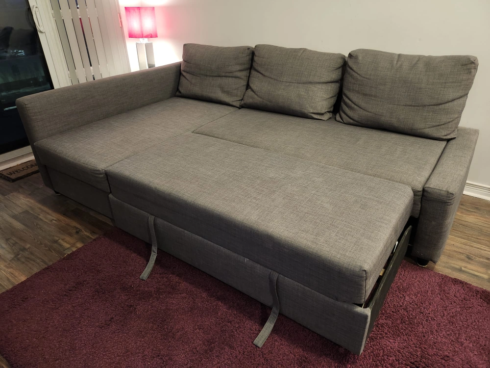 28Grey corner sofa couch with option to change L shape. Pull out sofa bed with storage. Includes three cushions. Smoke free and pet free condition. See pics for dimensions. Pick up only. Will be disassembled in multiple pieces for pickup.
