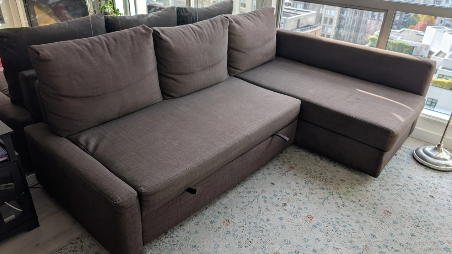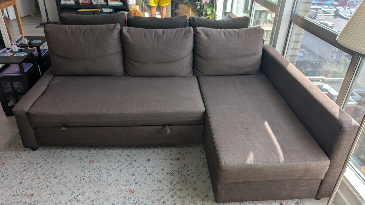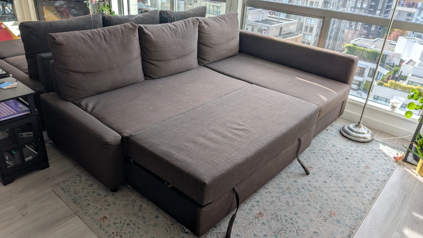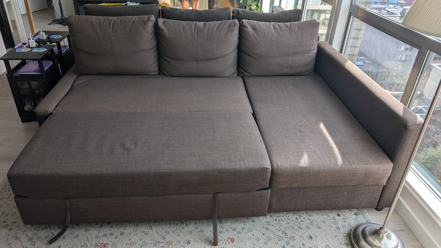 65Sofa chaise and double bed in one. Chaise section can be switched on left or right. Storage space under the chaise. The sofa has a pull-out section that transforms it into a bed. Non-smoking , no pet household.