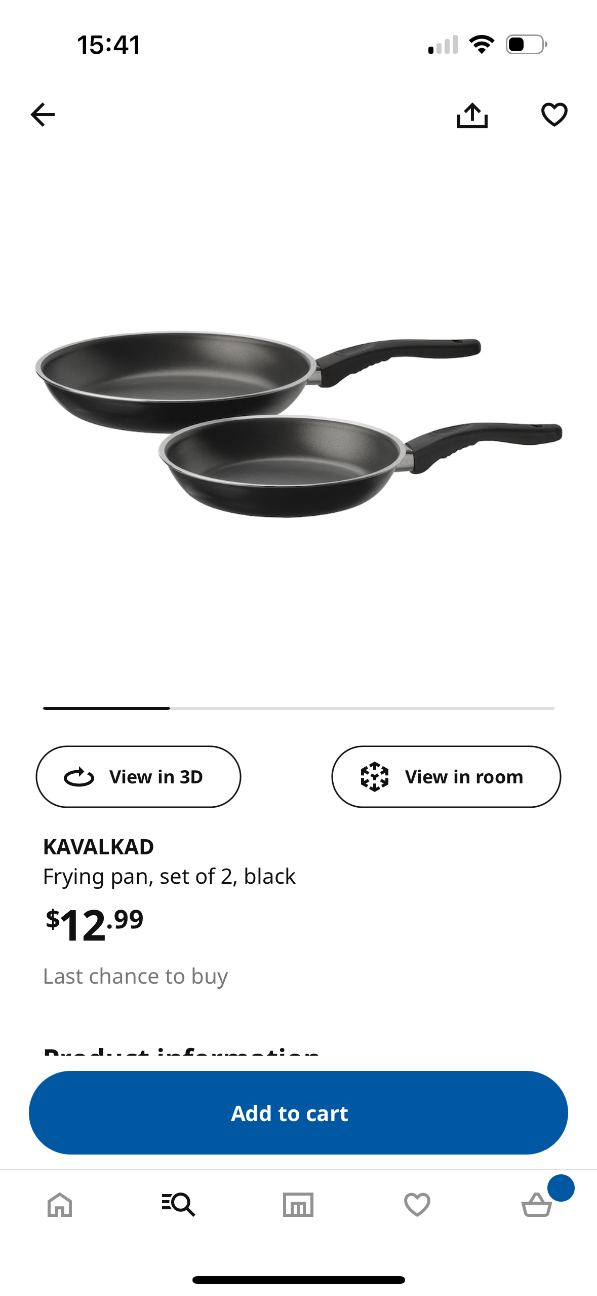 IKEA KAVALKAD frying pan, big one available (BOUGHT 2 AND ONLY NEEDED THR SMALL ONE) Lightweight Teflon Coated Non-Stick Frying Pans in 10" diameters. Black. Key features - The pan's low weight makes it easy to handle when filled with food. - Made from aluminum, which spreads heat evenly and energy efficiently, and makes it easier to regulate heat so the food does not burn and stick. - Treated with Teflon Classic non-stick coating that makes cooking and cleaning easy. Care instructions Handwash only. Suitable for use on gas cooktop. Suitable for use on ceramic glass cooktop. Suitable for use on electric cooktop. Product description Aluminum, Coated with Teflon(R) Classic, Phenolic plastic
