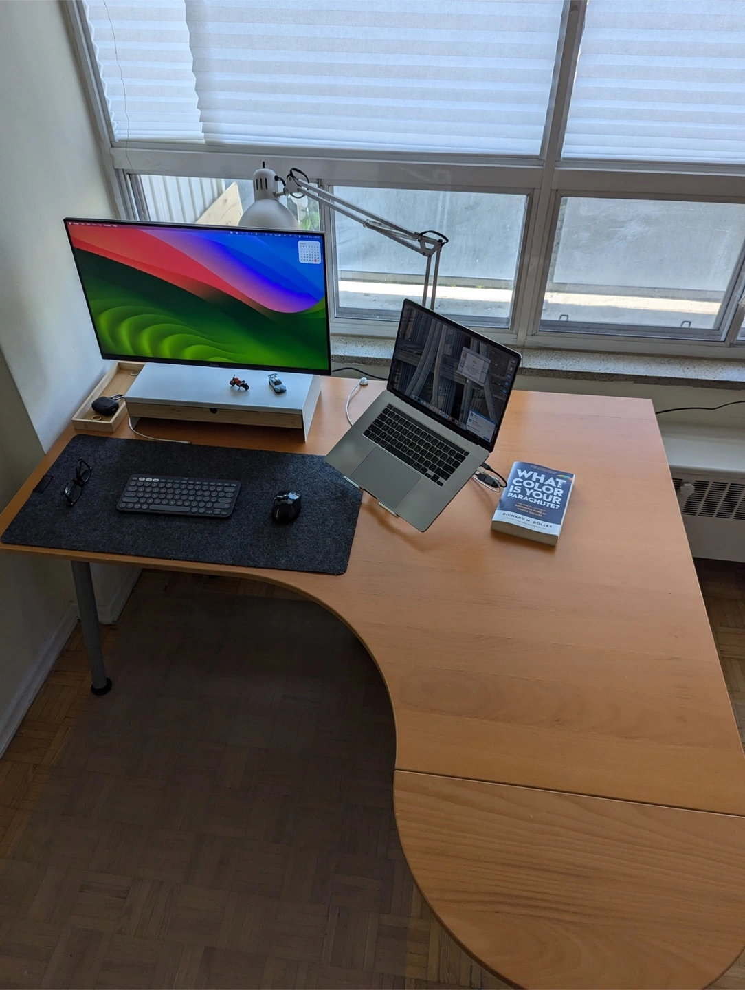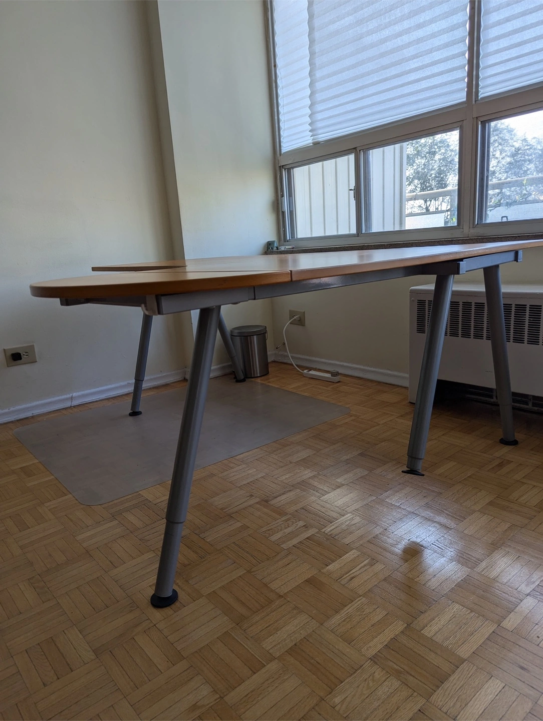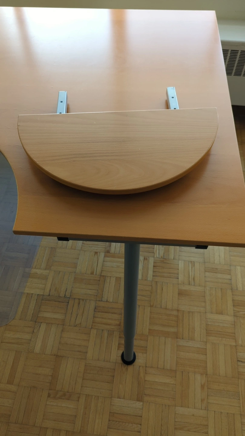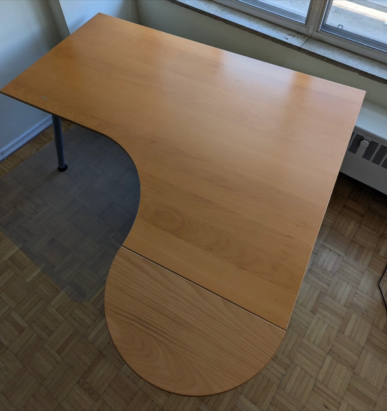 Spacious and functional work desk with a curved extension perfect for your home office, creative space, or study zone! • Dimensions: 63” x 47.5”(without extension) • Smooth wood finish with beautiful grain • Ergonomic curved design for extra comfort • Extension leaf for additional workspace • Solid metal legs – sturdy and stable • Legs are adjustable, but the height adjustment feature is currently not working (still functions perfectly as a standard-height desk) Pick-up near Davisville Subway Station Easy disassembly for transport (Need 2people to carry it!) Price : $120