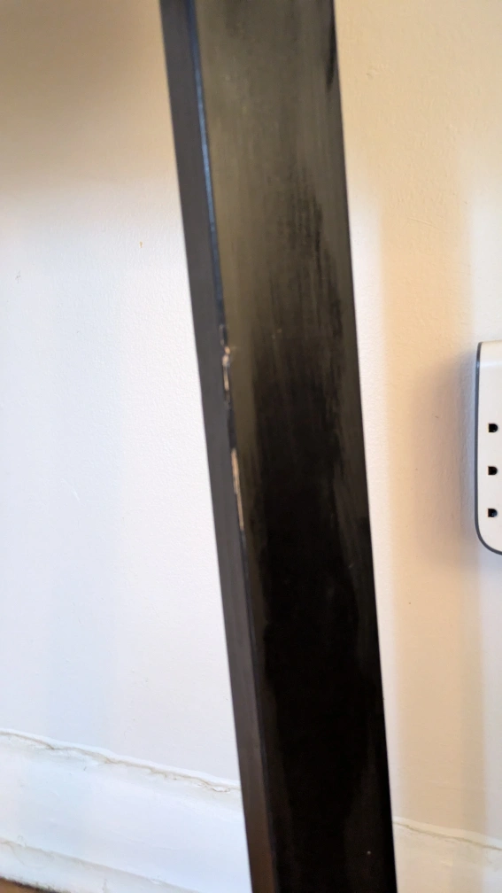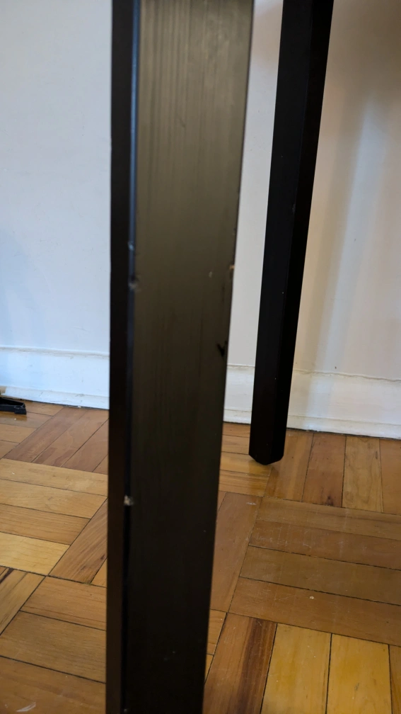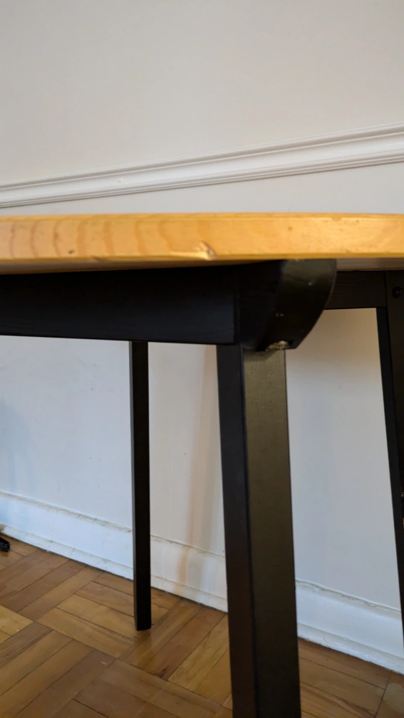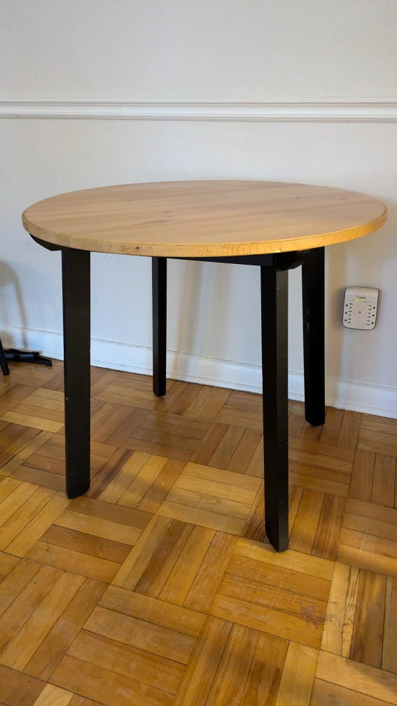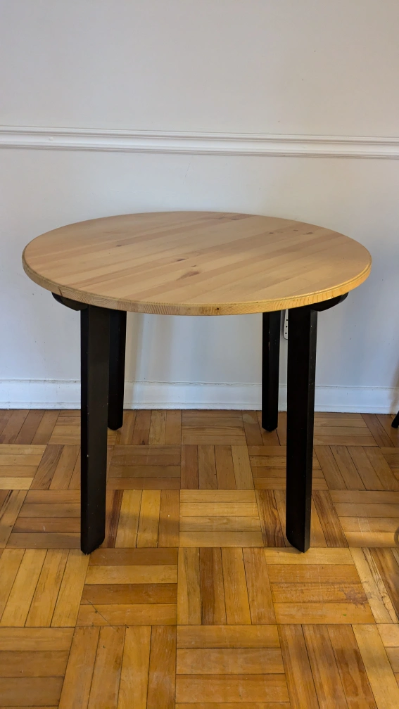 Small round dining table. Solid pine top, black painted legs. Minor scratches on legs and one dent on table top perimeter, pictures posted. Good condition.