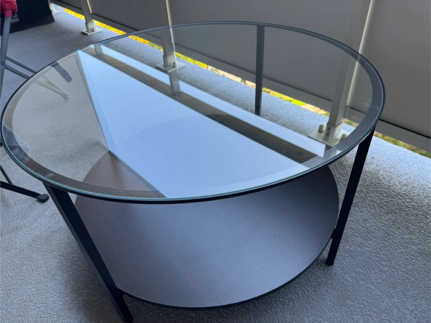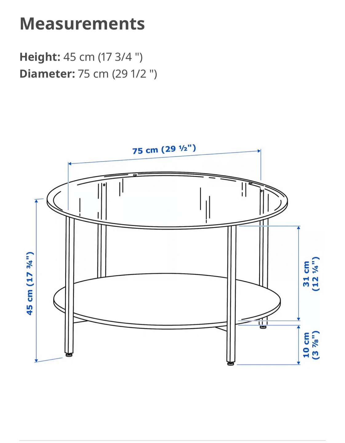 12Selling a coffee table with a glass top from Ikea! It's in great shape and would look lovely in any living room. Measurements: - Height: 45 cm (17 3/4 ") - Diameter: 75 cm (29 1/2 ")