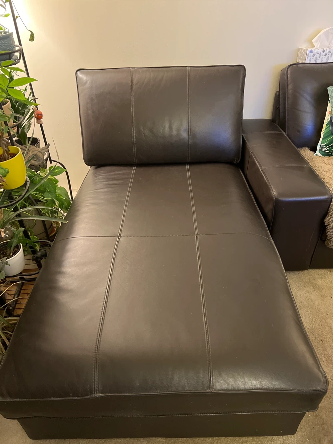 15Selling an IKEA chaise lounge in dark brown. It's in great shape and super comfy! The dimensions are approximately 90 cm (35 3/8") wide, 163 cm (64 1/8") long, and 45 cm (17 3/4") high. Perfect for relaxing!