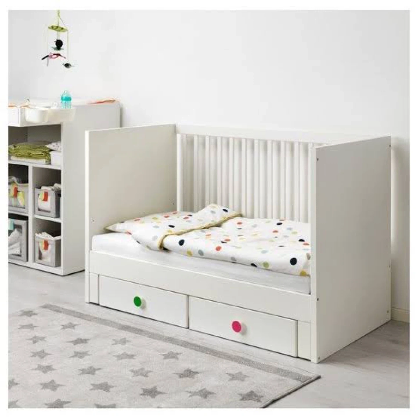 24Selling a gently used IKEA Gulliver crib in white! It features convenient drawers underneath for extra storage. Perfect for your little one's nursery. The crib is in good condition and ready for a new home! I apologize I don’t have pictures right now cause I dissembled it and it’s been put away in order the make room. I’ll sell it with the mattress already