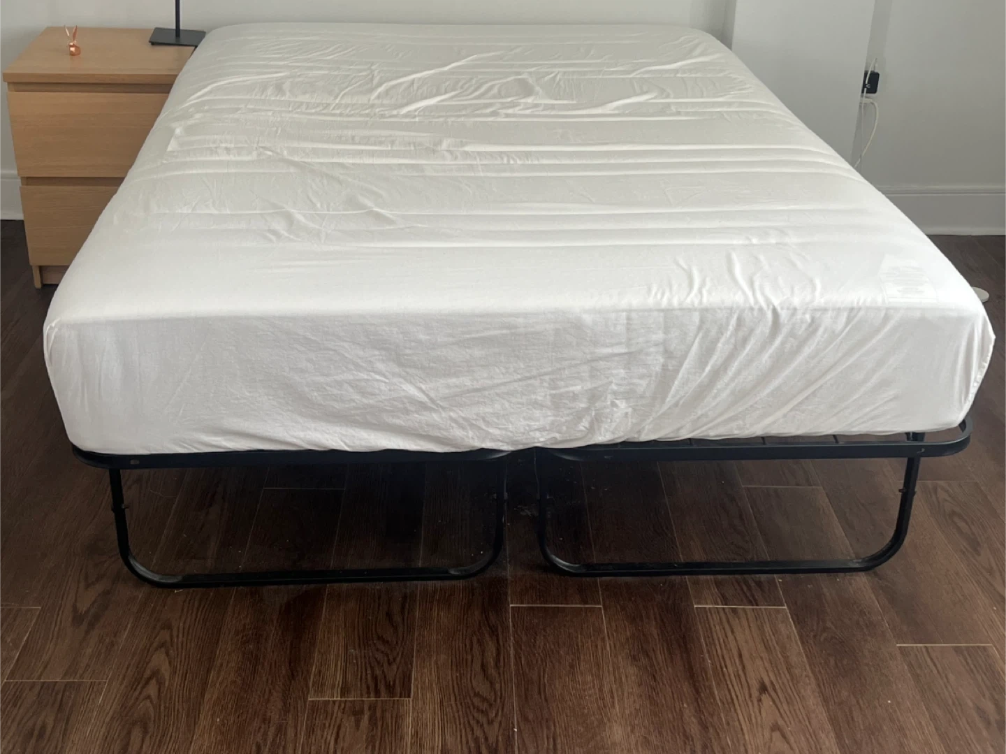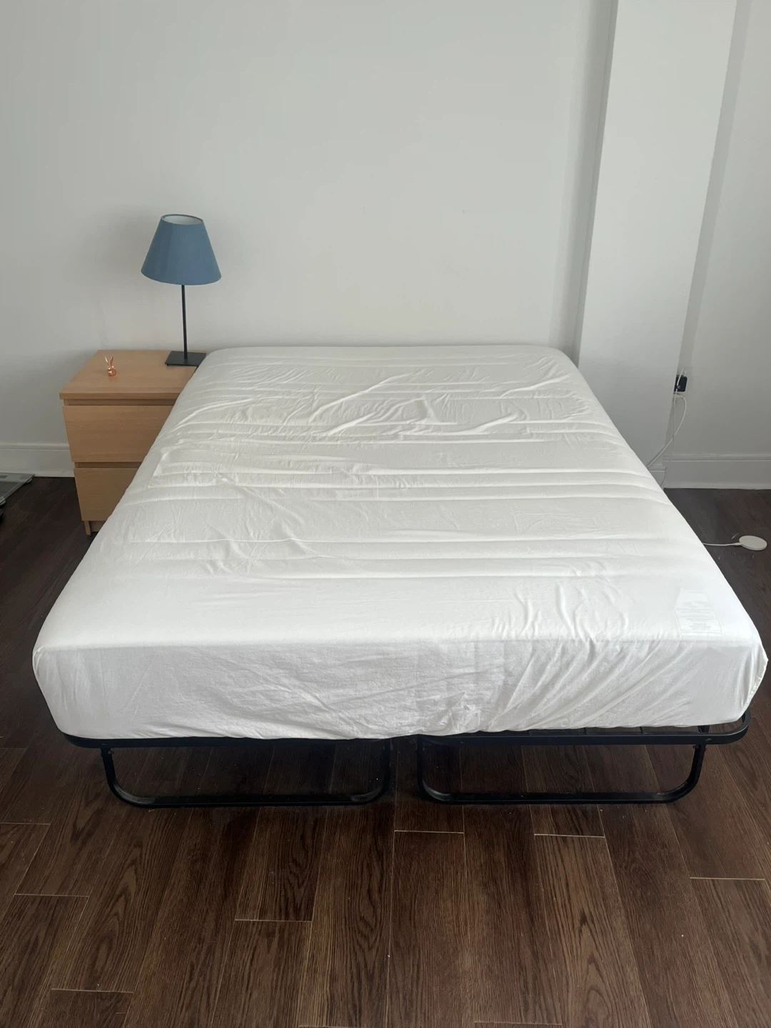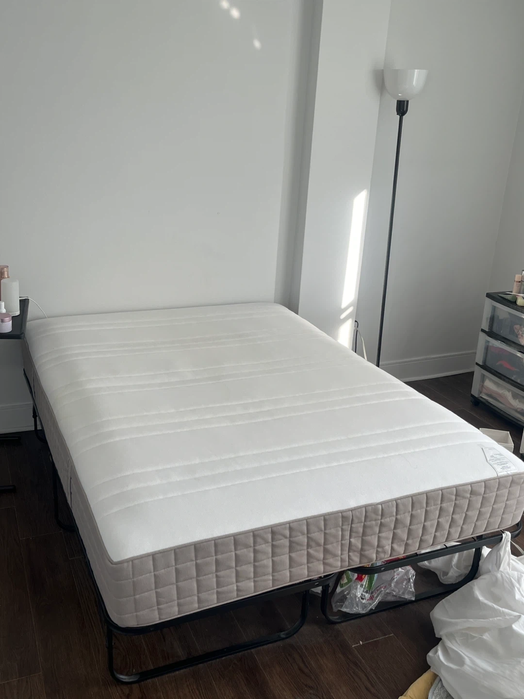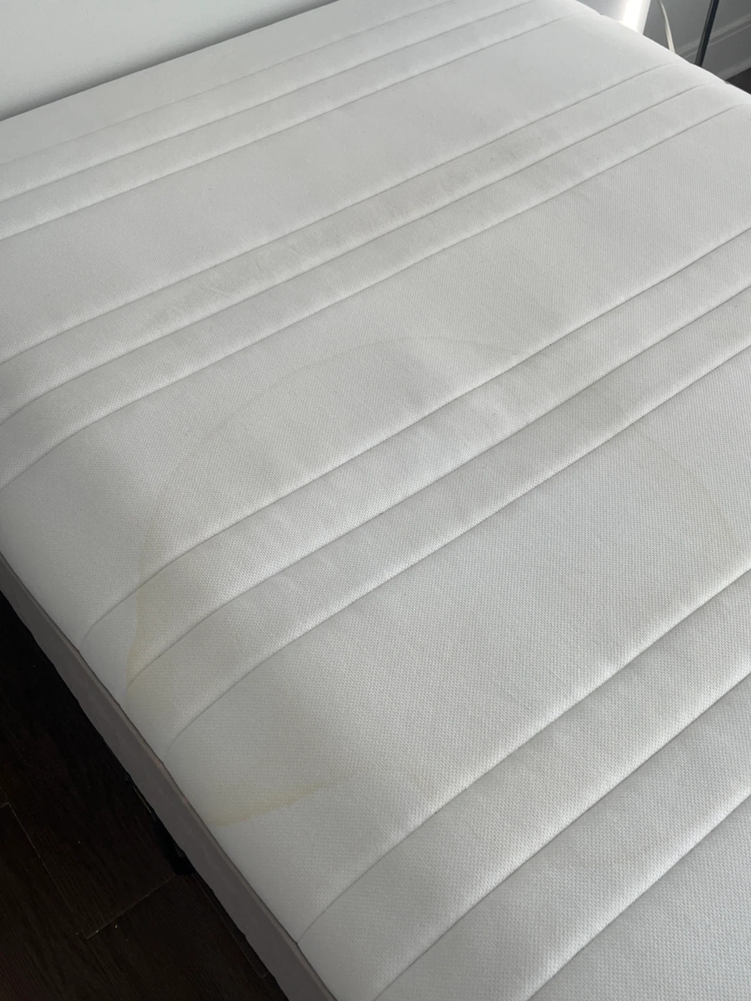 266Full-Size Haugesund Mattress – Gently Used, Very Comfortable. ❗️slight yellowing from regular use (See Photo 3 & 4) ‼️2 full-size bed covers included ‼️The black frame is a little squeaky, but I can include it for free if you buy the mattress!