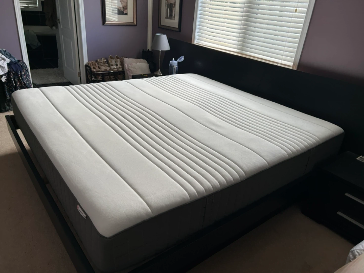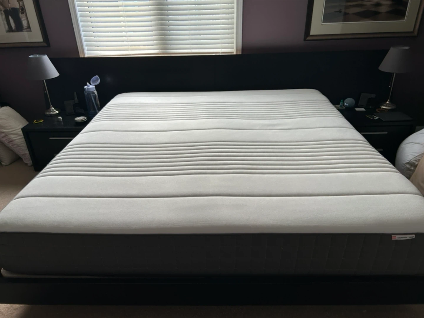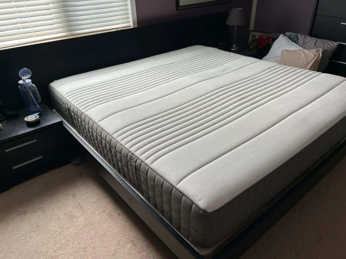 Selling an IKEA HAUGSVAR king size mattress! It's in great condition and super comfy. It features a quilted grey and white design. Perfect for a good night's sleep! 2yrs old. We used a mattress cover and mattress topper. Firm mattress.