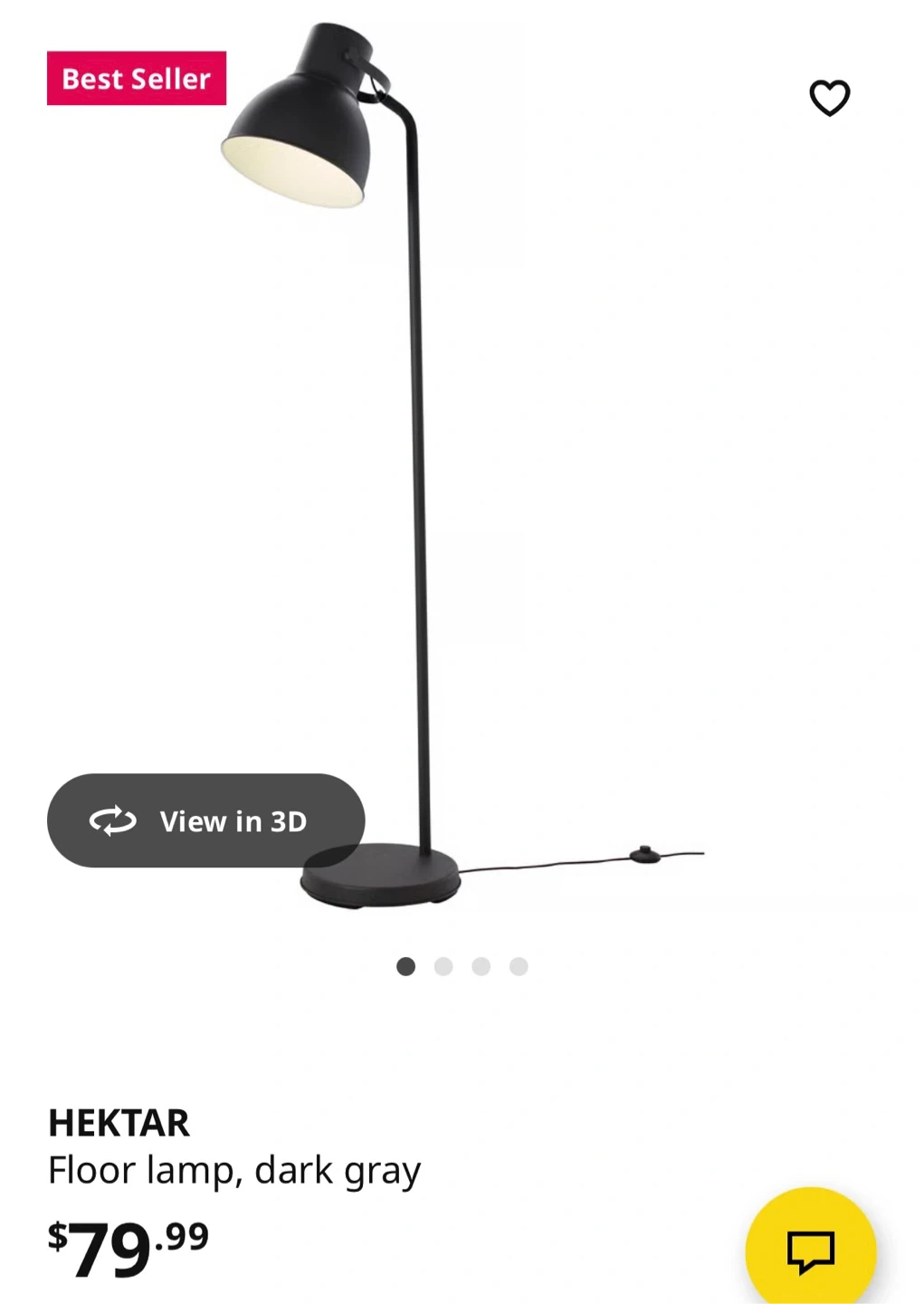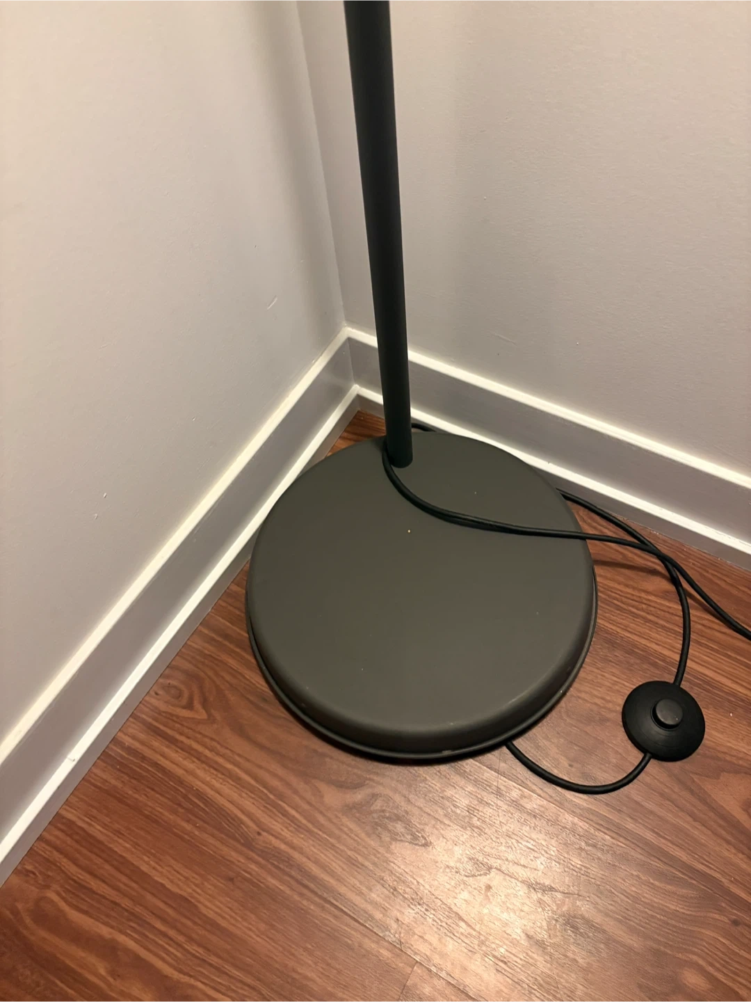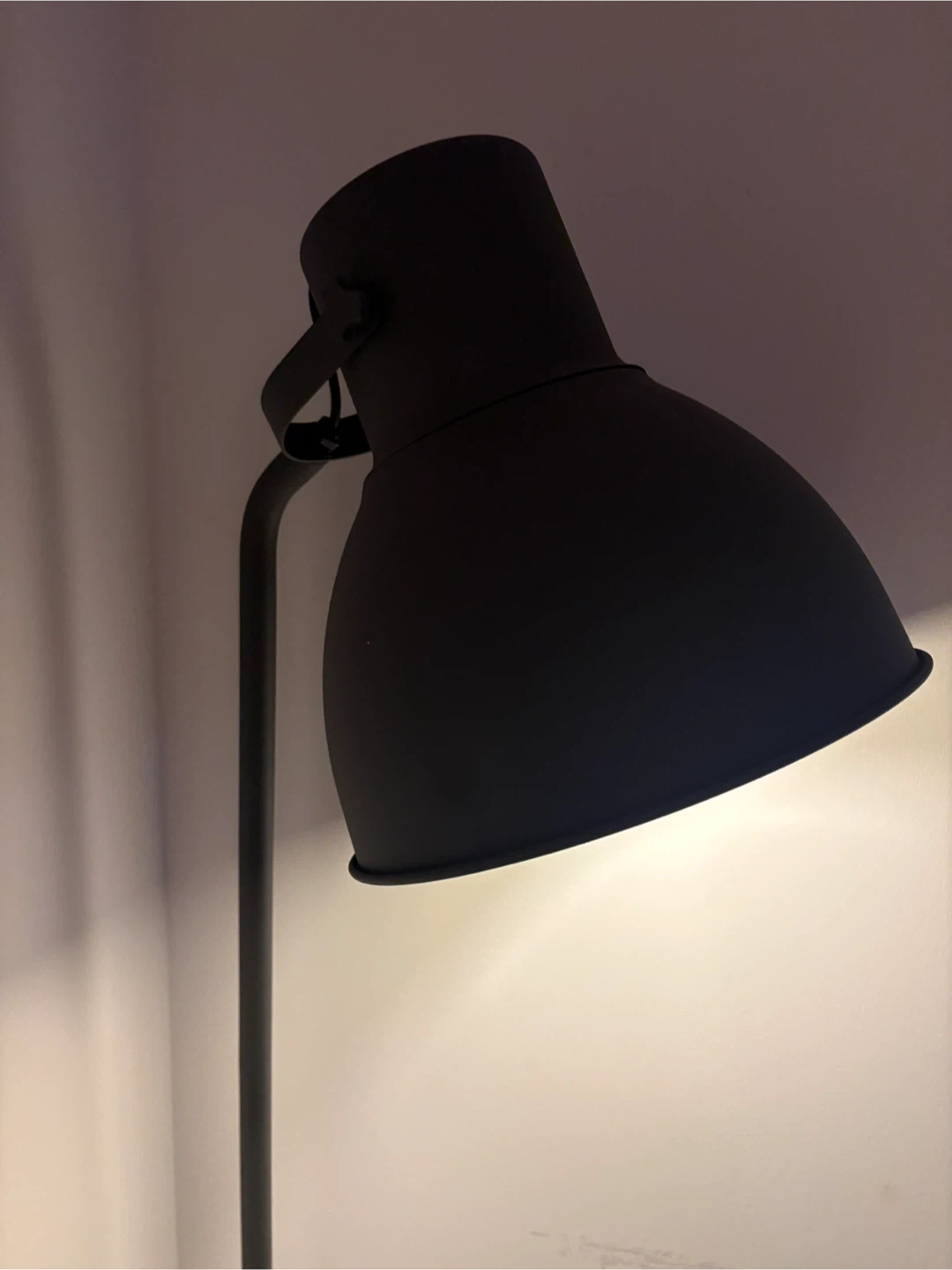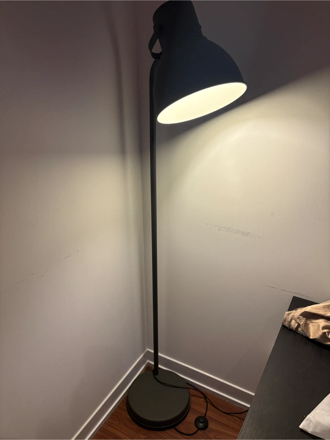 Selling an IKEA Hektar floor lamp in dark gray! It's in great condition and ready to brighten up your space. This stylish lamp originally retails for $79.99 and offers a focused light, perfect for reading or creating a cozy atmosphere Can come with a new extra light bulb
