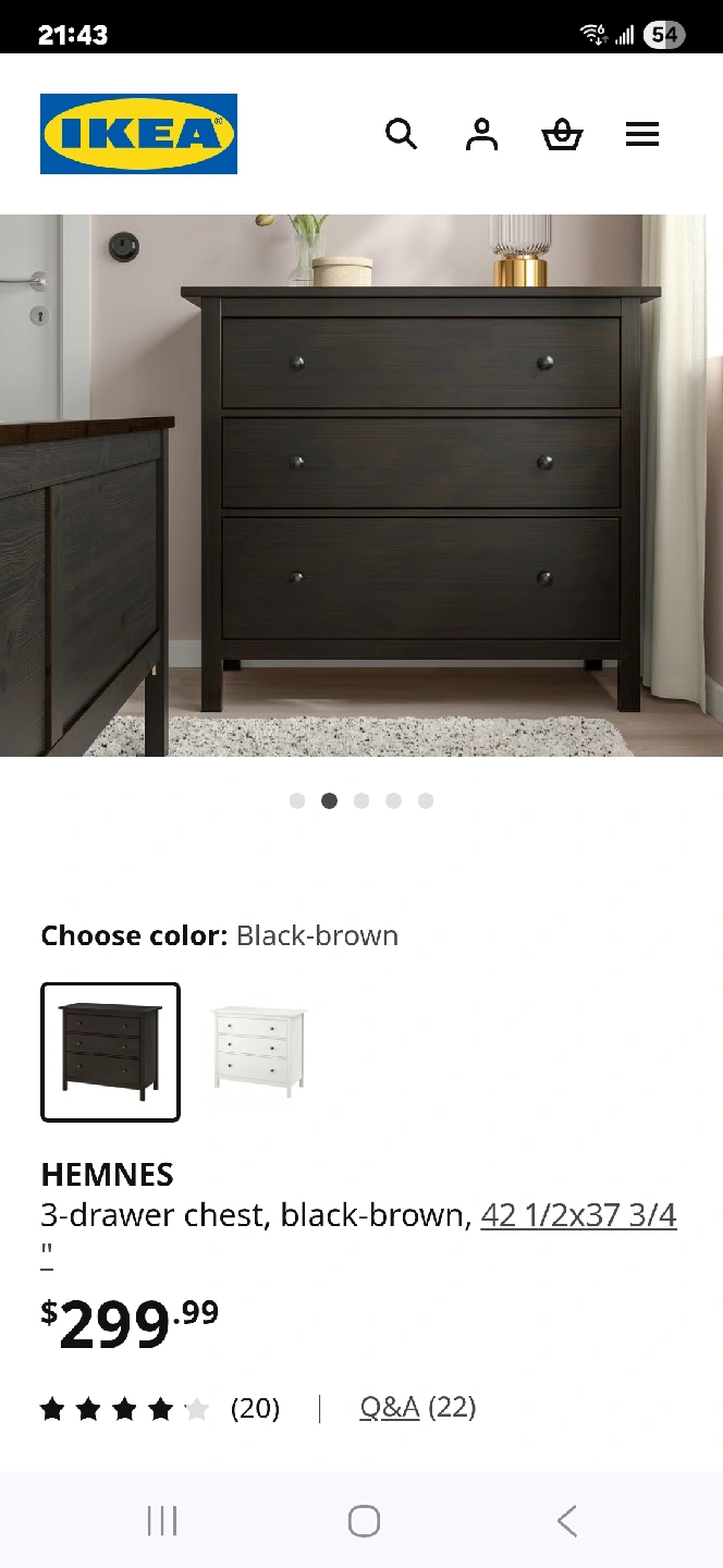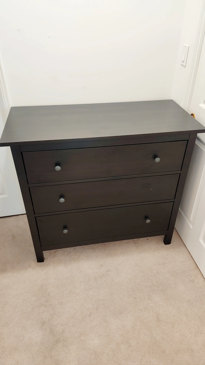 311like New IKEA Hemnes 3-drawer chest in black-brown! It's in great shape and ready for a new home. The dimensions Width: 42 1/2 " Depth: 19 5/8 " Height: 37 3/4 " Drawer depth (inside): 16 7/8 " Height under furniture: 4 3/8 " Storage capacity: 6.1 cu.ft Drawer pull-out: 9 7/8 Originally bought for $299.99+ Tax Moving Sale