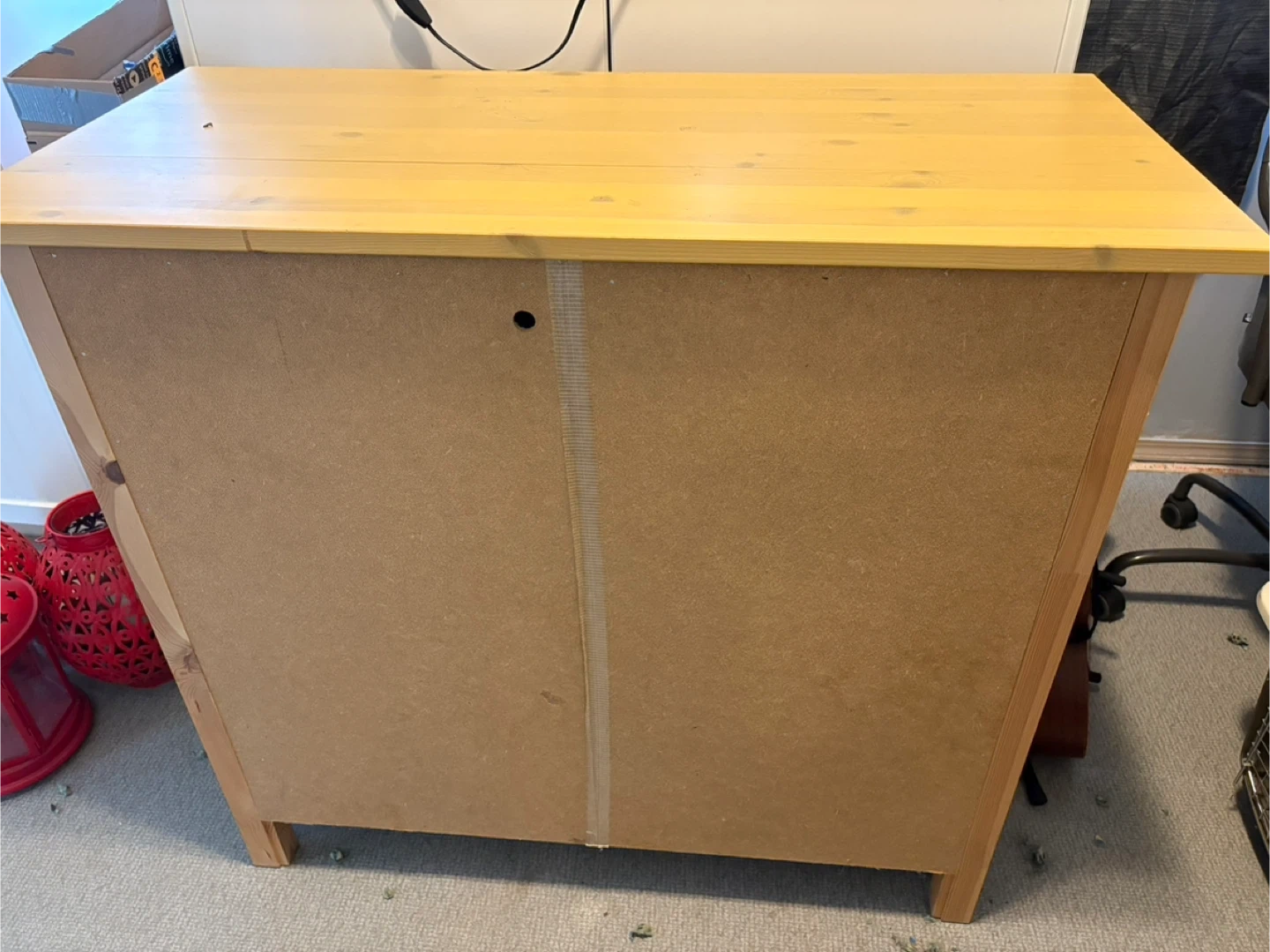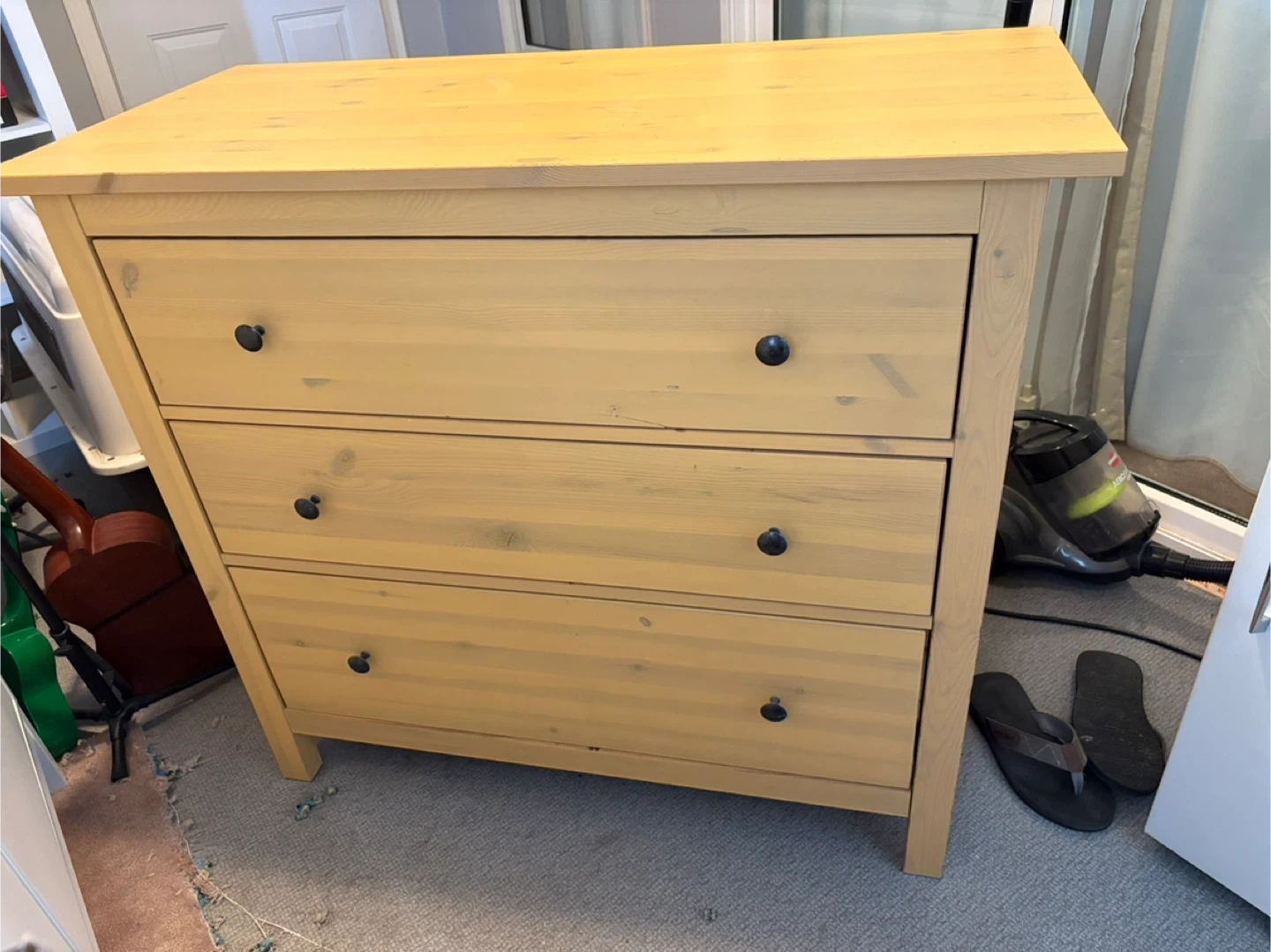 43Selling an Ikea Hemnes 3-drawer dresser. It's in good condition and would be a great addition to any bedroom or living space. There is a small crack on one of the drawers, as pictured. Discontinued colour.