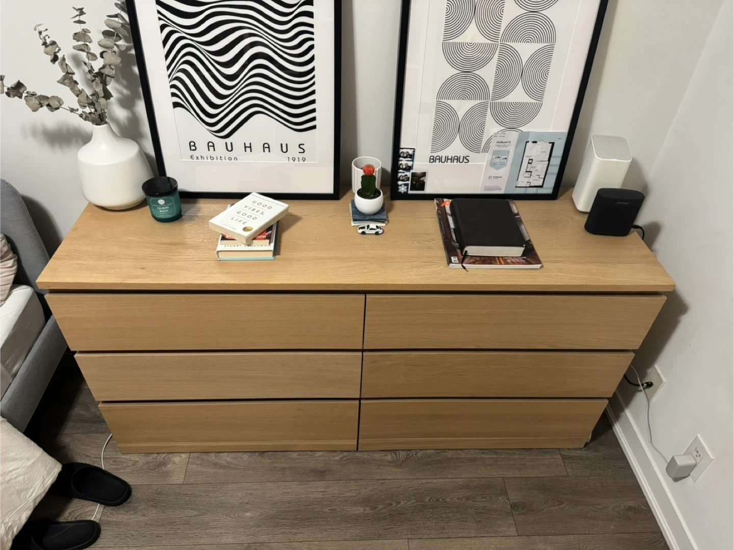 20Selling a used IKEA Hemnes 6-drawer dresser. It's in good condition and has lots of storage space. Perfect for a bedroom or any room needing extra organization! (A small stain on the left side of the top panel)