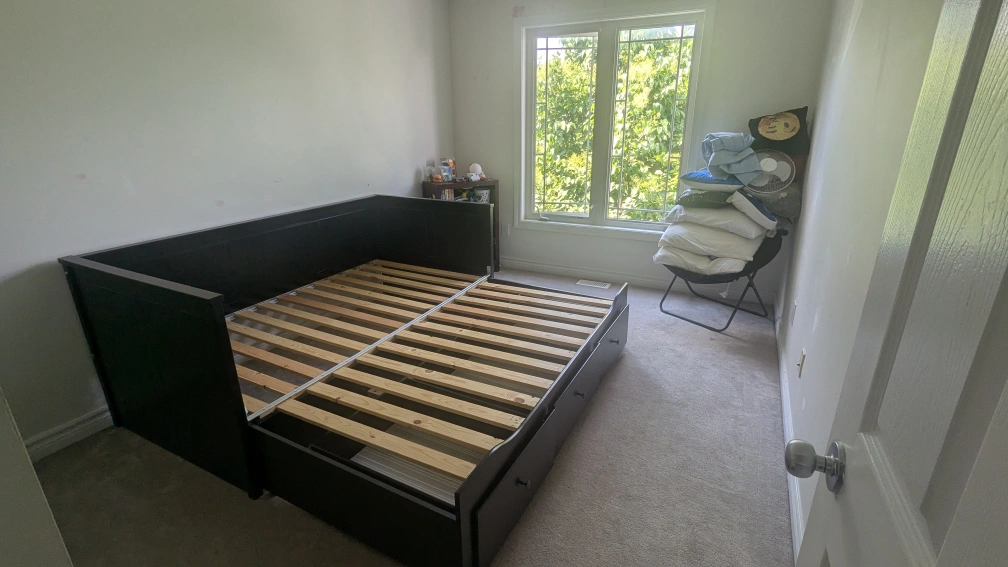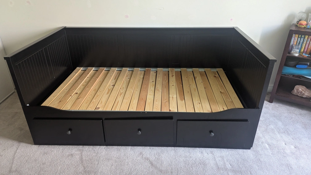 92Selling an Twin Ikea Hemnes daybed frame in black-brown. It's in good shape and ready for a new home! This versatile piece can be used as a sofa and pulls out to a double bed, perfect for a guest room or small space. It also has three drawers for extra storage