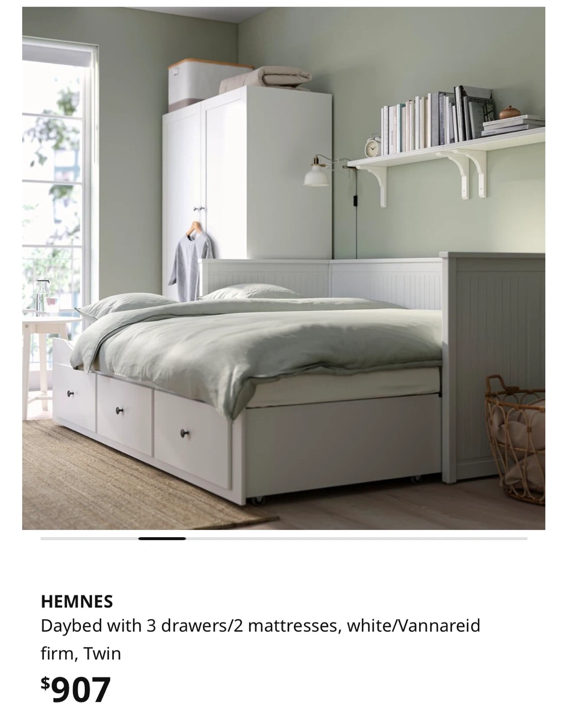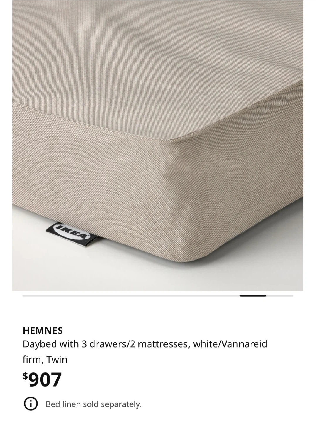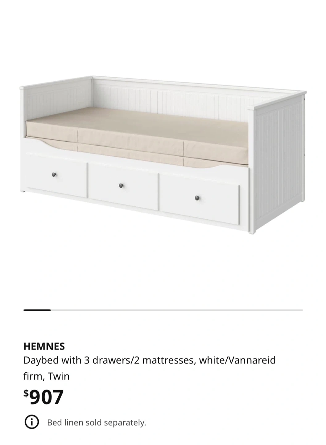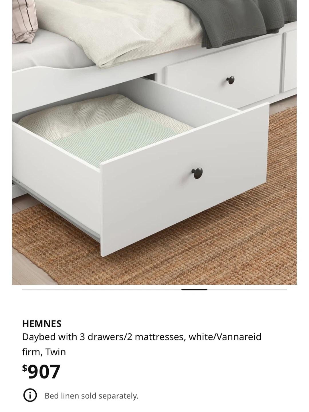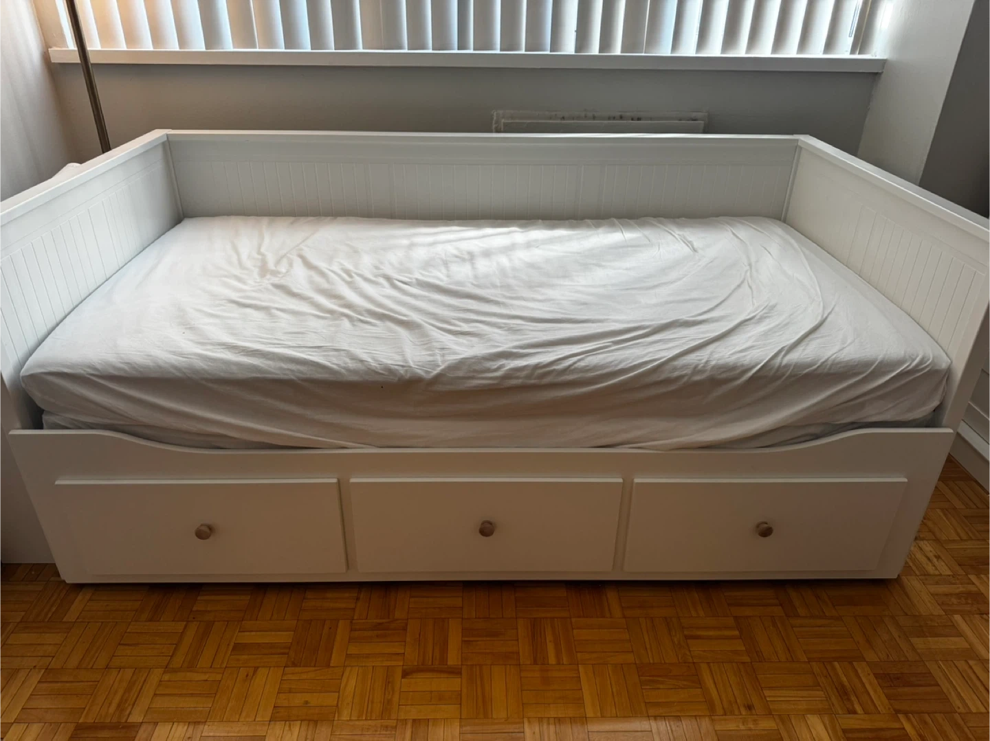 27Selling my white IKEA HEMNES daybed, bought last year and in excellent condition. This versatile piece converts from a single into a king bed, with 3 large storage drawers underneath. Comes with 2 firm VANNAREID spring mattresses, and 2 sheet covers. ✔️ Very good condition – invoice available ✔️ Stylish + practical with extra storage ✔️ Pick-up only, already disassembled Got it for $997 after tax selling for 500 after one year mildly use