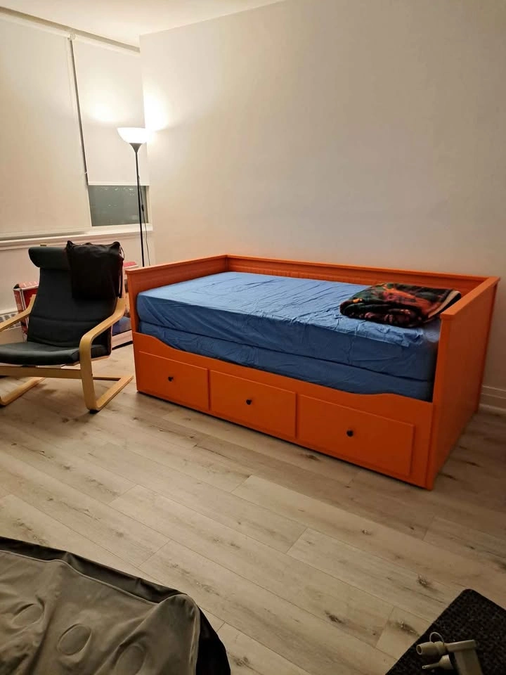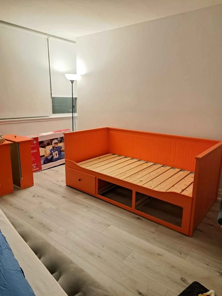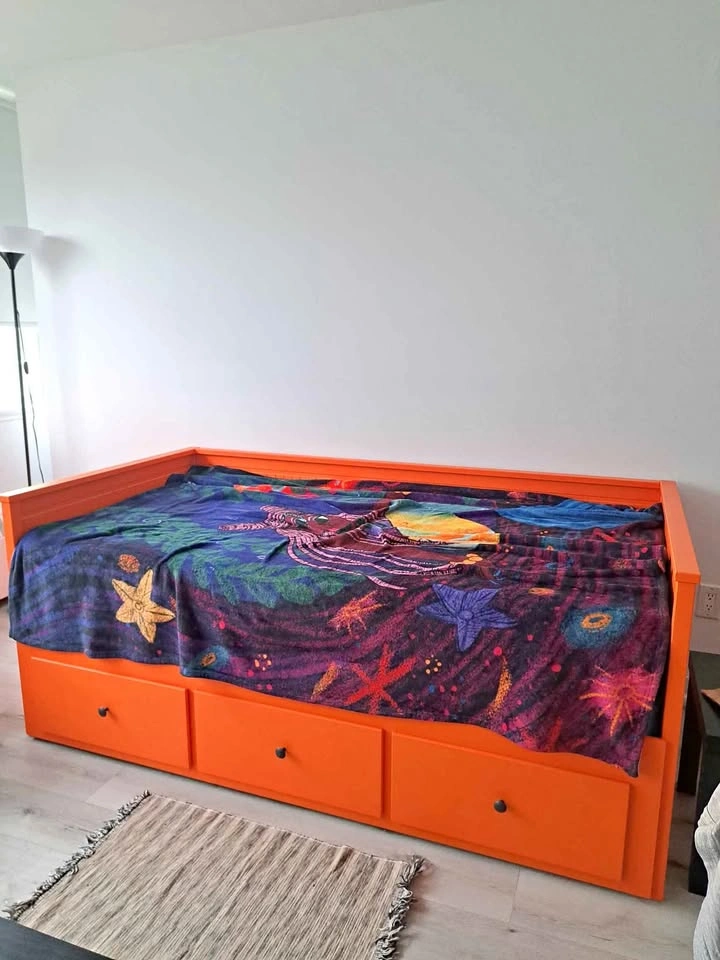 65Daybed frame was originally white, but has been painted orange for a pop of colour. IKEA daybed with 2 twin mattresses (not from Ikea). I am also including sheets, bedding and pillows. Pickup near Yonge&Eg.