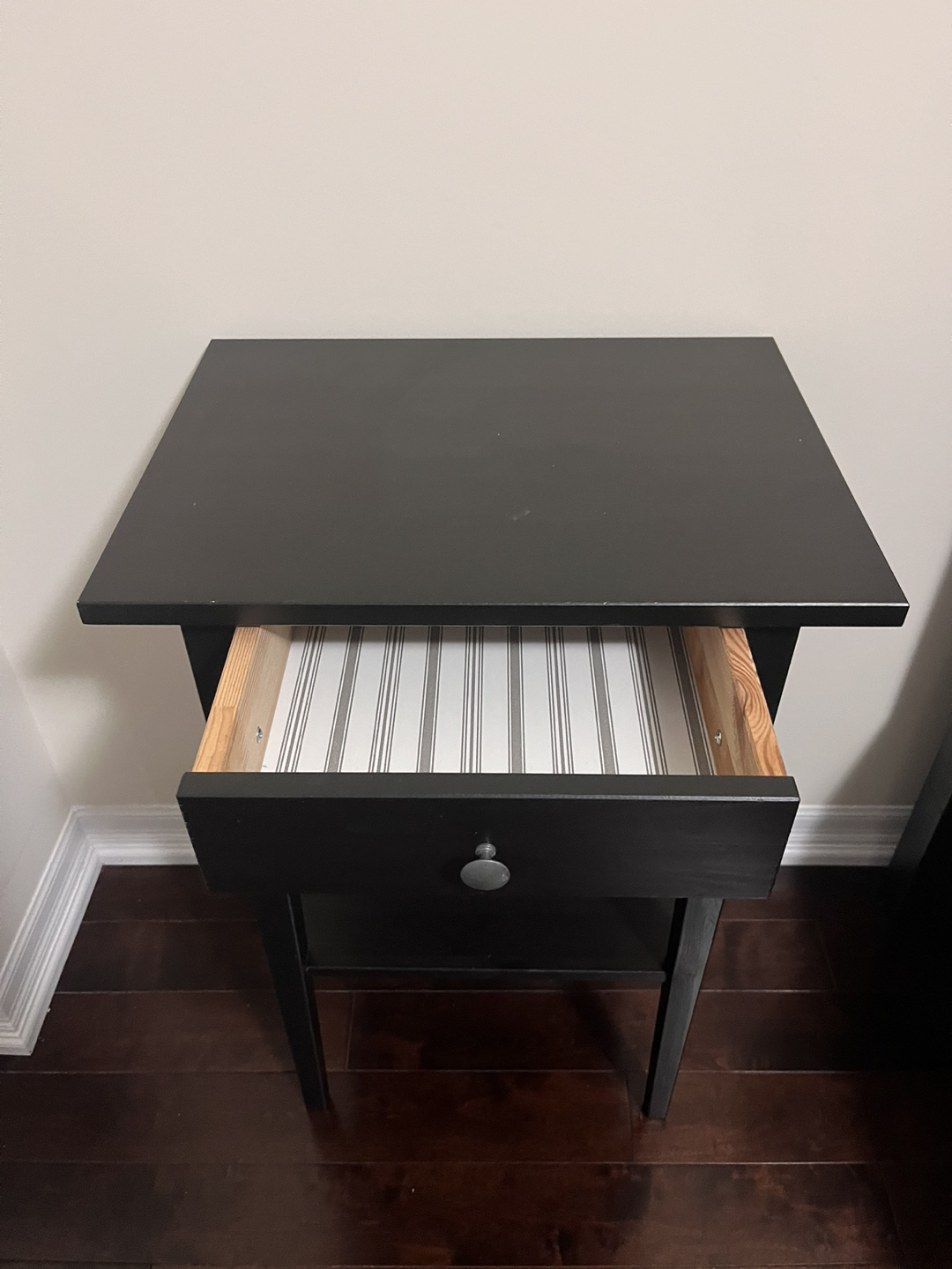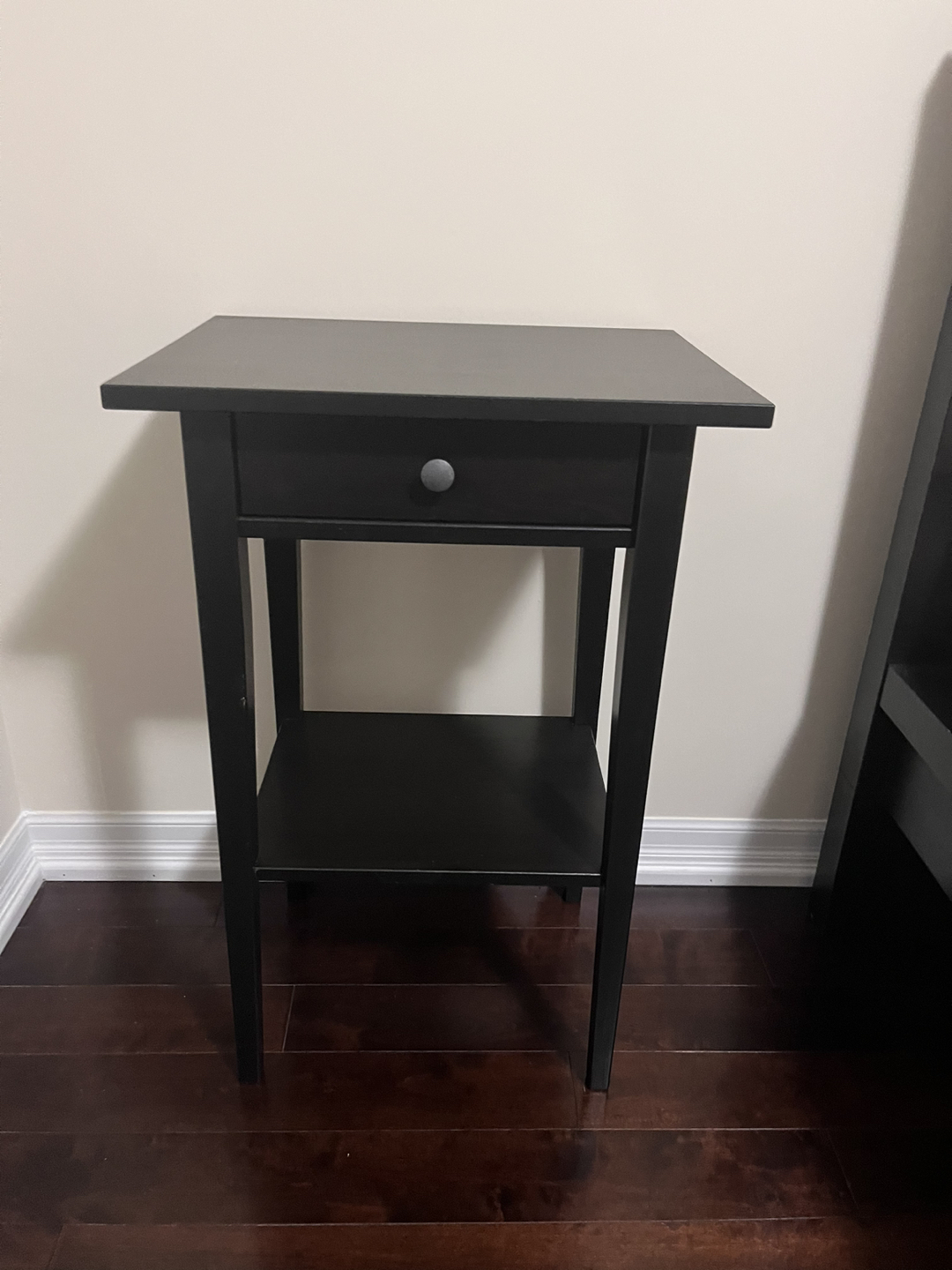 IKEA Hemnes Nightstand Hemnes nightstand, solid wood (pine) in black. In very good condition. Retail price: $79 Dimensions: 46 x 35 x 70cm Description from IKEA: A high table that is just as convenient by the bed as in the entrance or as a side table by your favorite armchair. Includes a smooth running drawer with pull-out stop. Pick up only at Yonge & Finch.