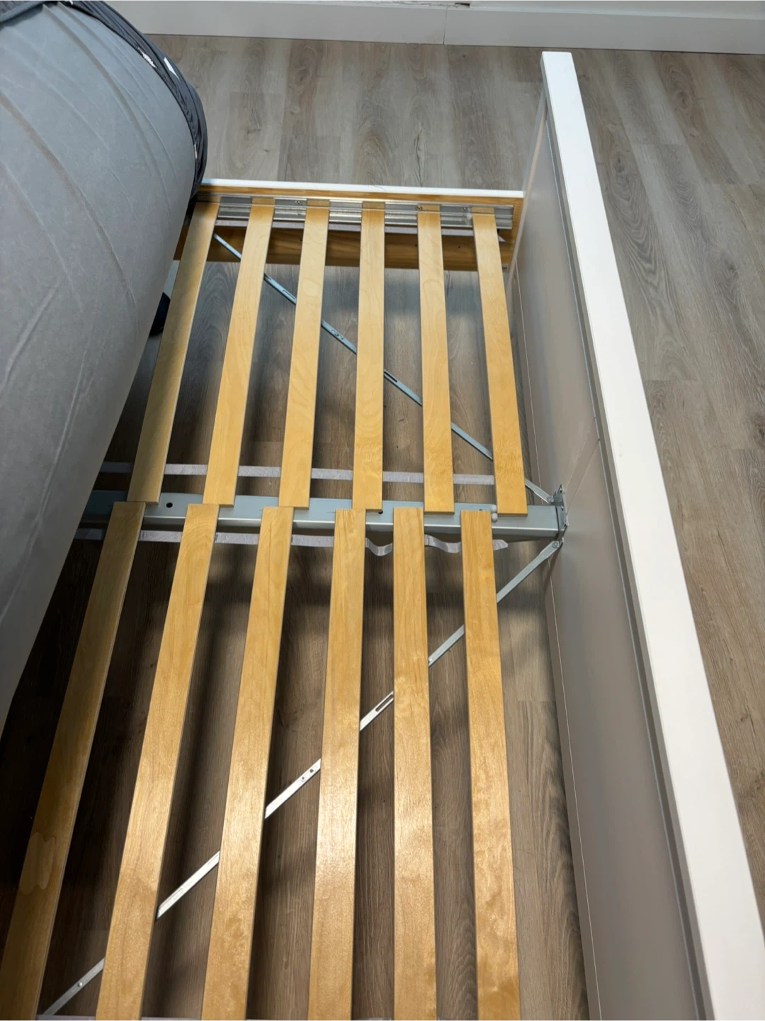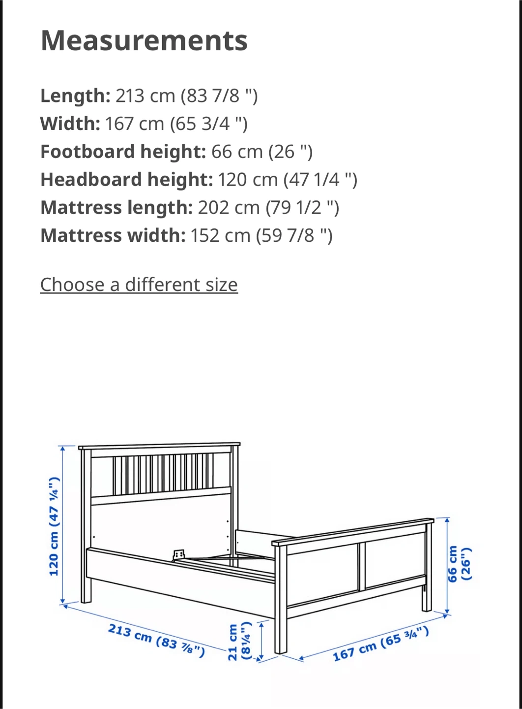 Selling an IKEA Hemnes queen bed frame in white. It's in great condition. Measurements: - Length: 213 cm (83 7/8 ") - Width: 167 cm (65 3/4 ") - Footboard height: 66 cm (26 ") - Headboard height: 120 cm (47 1/4 ") - Mattress length: 202 cm (79 1/2 ") - Mattress width: 152 cm (59 7/8 ") Mattress is not included.
