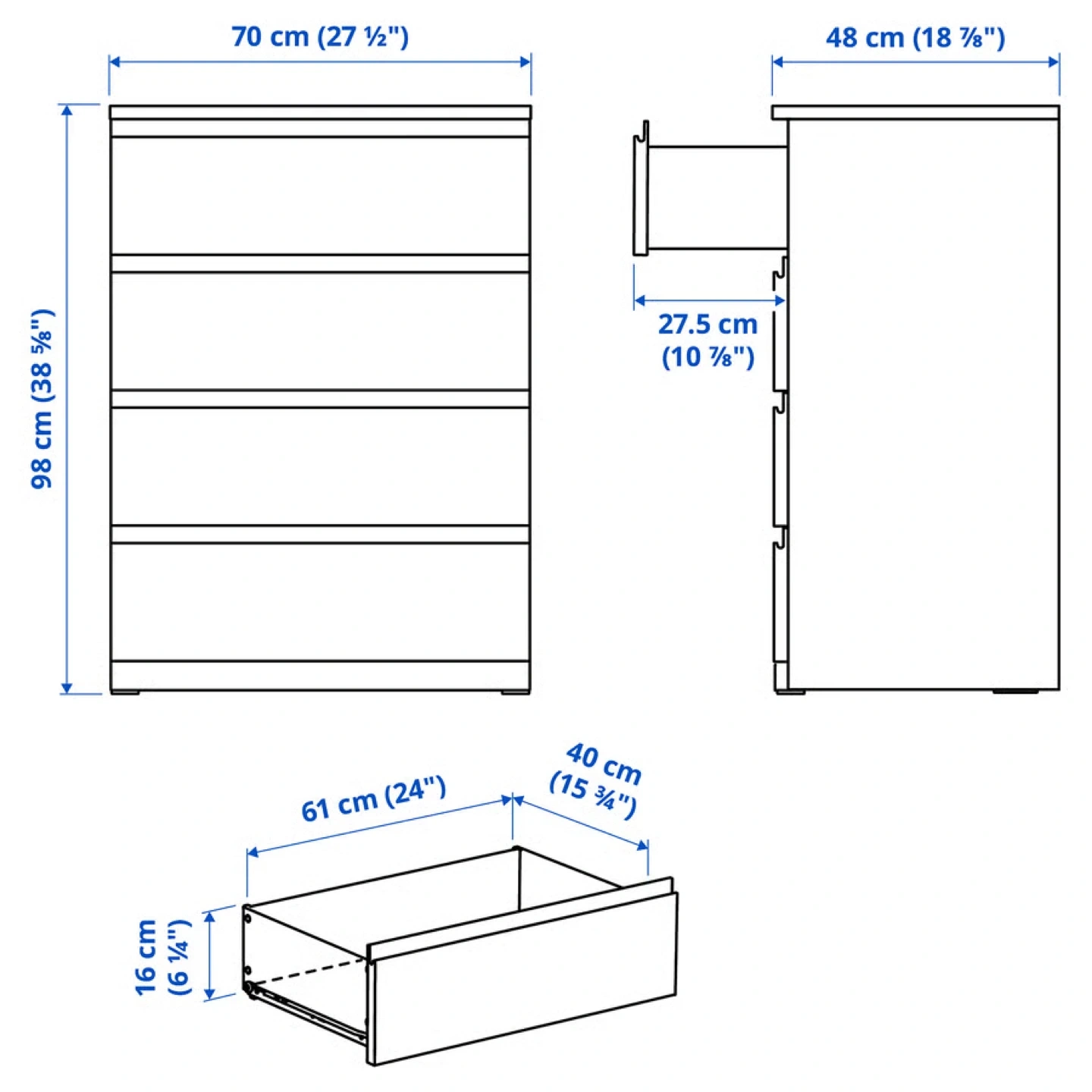 21Selling a white IKEA Hemnes chest of drawers with 4 drawers. It's in great shape and ready for a new home! Dimensions: - Width: 27 1/2 " (70 cm) - Depth: 18 7/8 " (48 cm) - Height: 38 5/8 " (98 cm) - Drawer depth (inside): 15 3/4 " (40 cm)