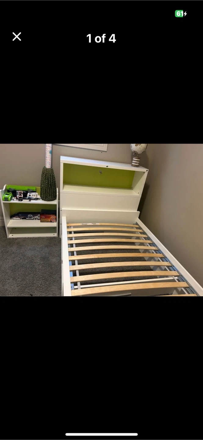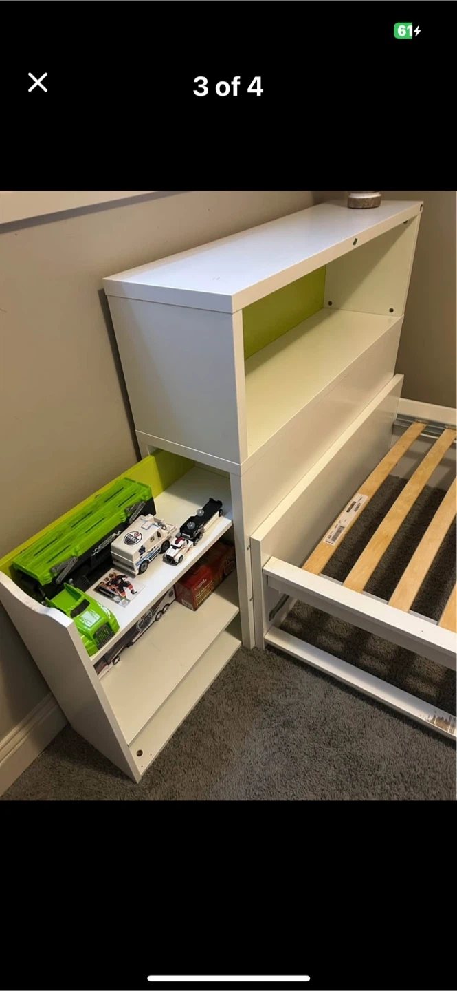 60Selling an IKEA Hemnes bed frame in white with built-in storage! It's in great condition and perfect for a kid's room. The bed frame features a headboard with shelving .NO pull-out drawer for extra storageIt's a practical and stylish addition to any bedroom