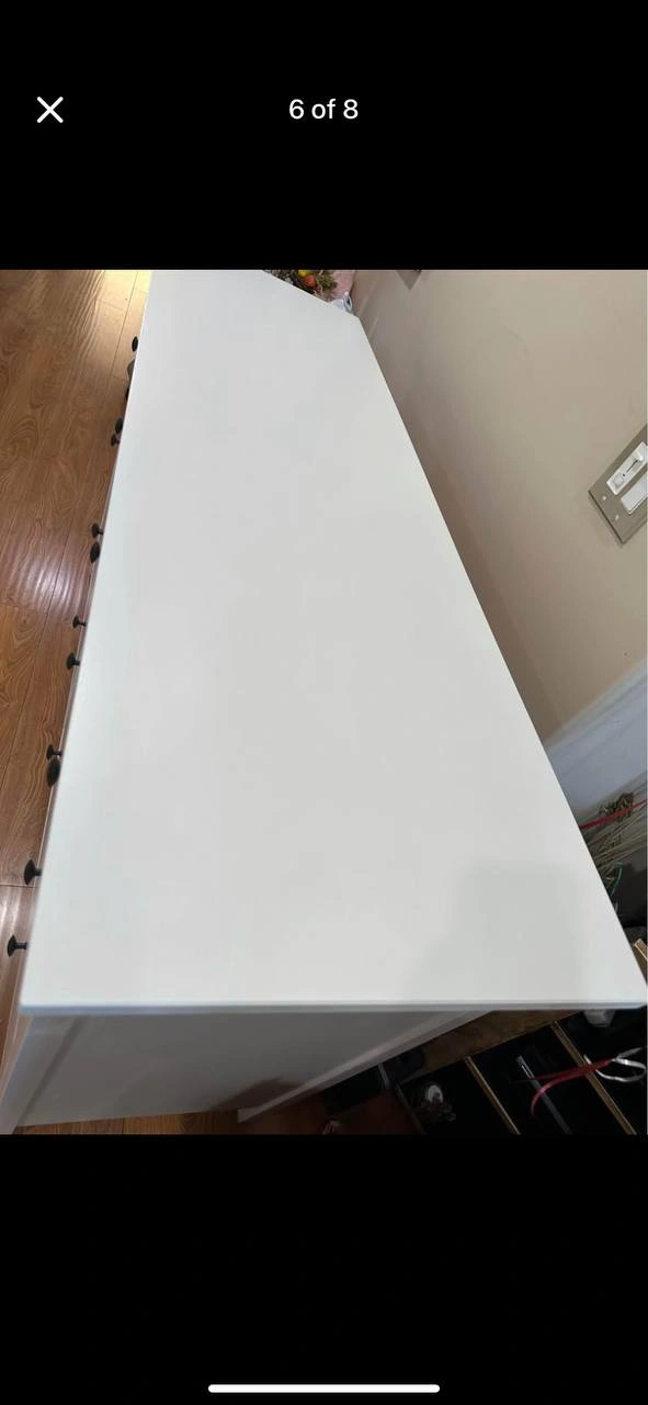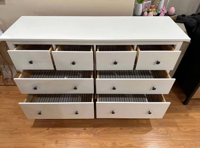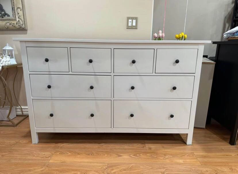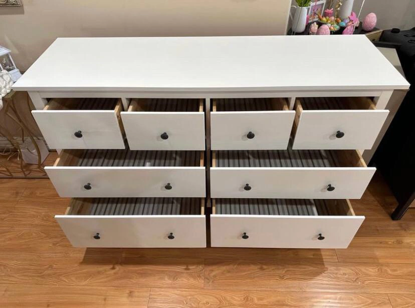 10Selling a white dresser with eight drawers! It's perfect for organizing clothes or anything else you need to store away. The dresser has a clean and simple look that would fit well in any bedroom or living space IKEA Hemnes white dresser in great condition and great shape ,no scratches or dent all drawers slide and close perfectly . Width: (63 ") Depth: (19 ") Height: (37 ")