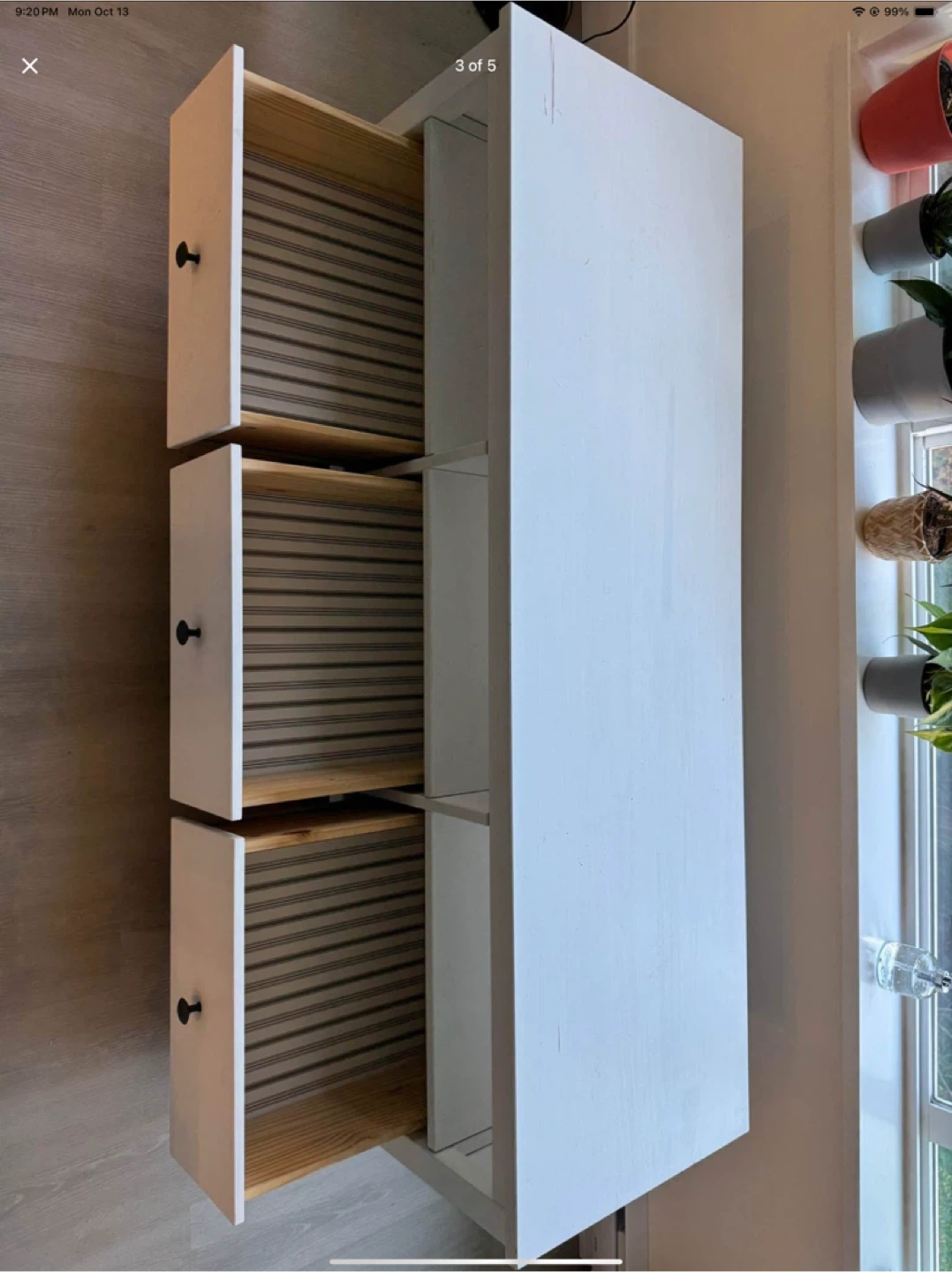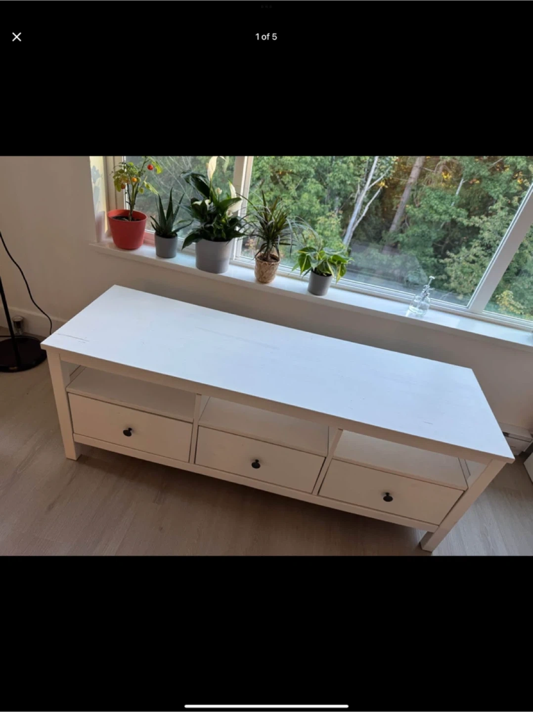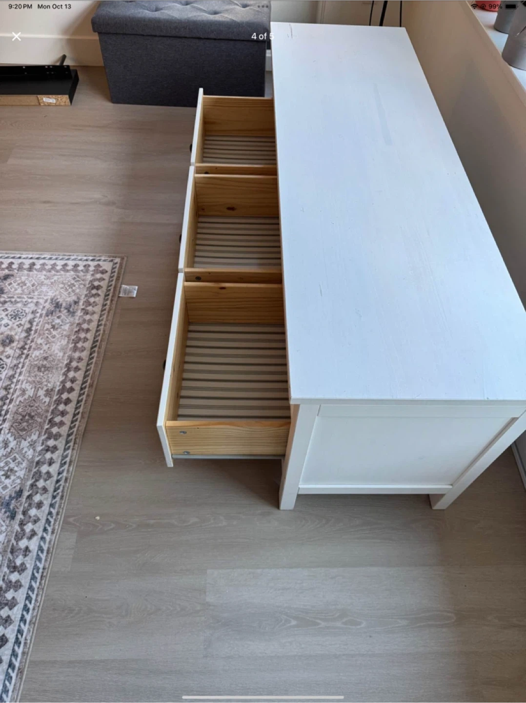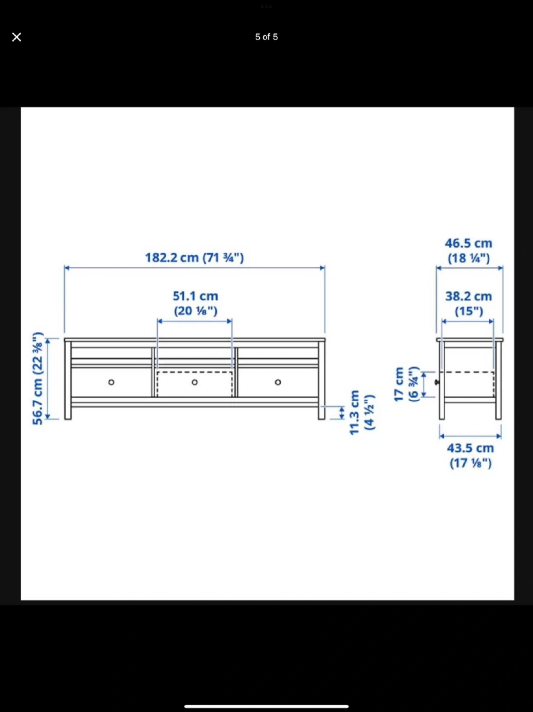 12Selling a white IKEA Hemnes TV stand/storage unit. It has three drawers and open shelving. The dimensions are: - Length: 71 3/4 inches - Width: 18 1/4 inches - Height: 22 3/8 inches