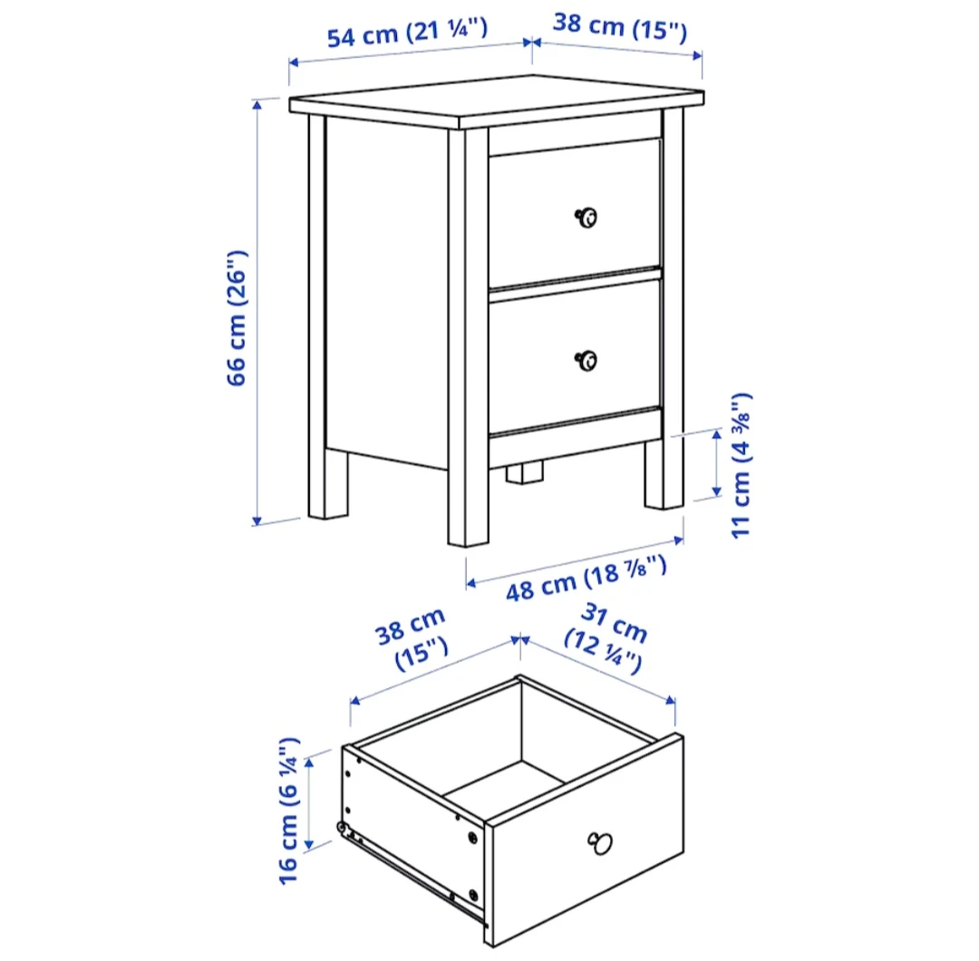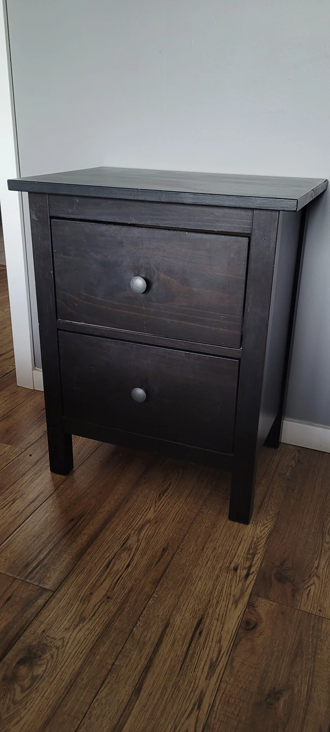 46Black-brown Ikea HEMNES 2 drawer chest. Works well as a bedside table/night stand. Some minor scratches on the top and sides (see photo 2). Drawers slide smoothly. One drawer has an insert for small items (see photo 3). Original retail price: $129. Main parts are solid wood (pine). From a smoke-free home with one cat. Available for pickup near Kitsilano/ Fairview area.