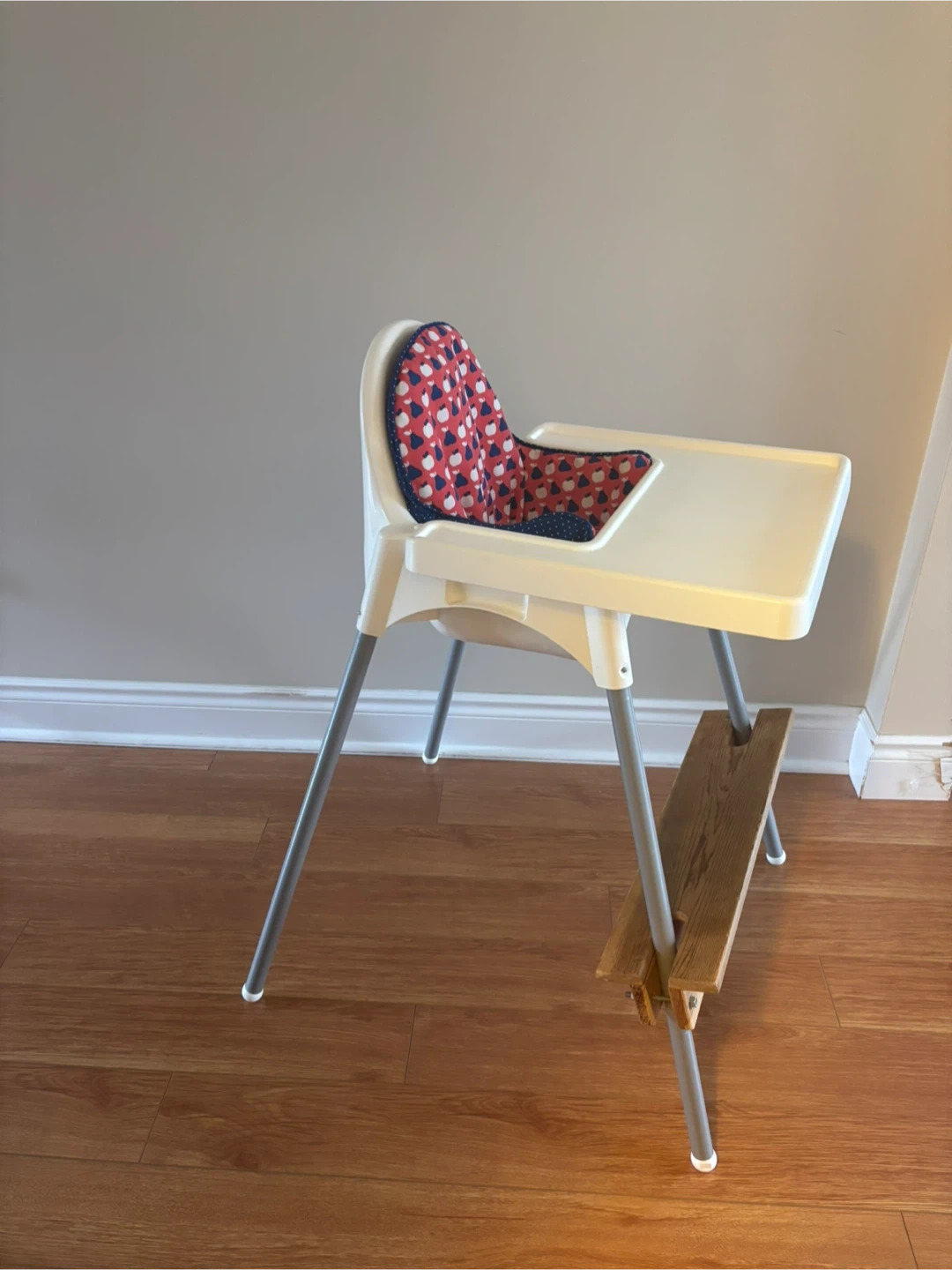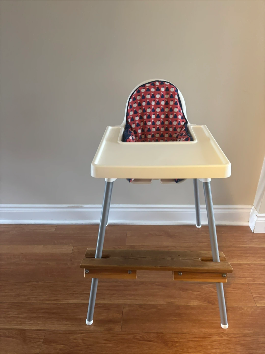 This ikea baby high chair comes with the tray and cushion insert ($45 value if you were to buy brand new from ikea). The chair has been used very gently and is in “like new”condition. In addition, we added a diy modification to support baby’s feet - you can move the wood plank up and down to ensure fit as the kid grows. Remember, foot support is very important!