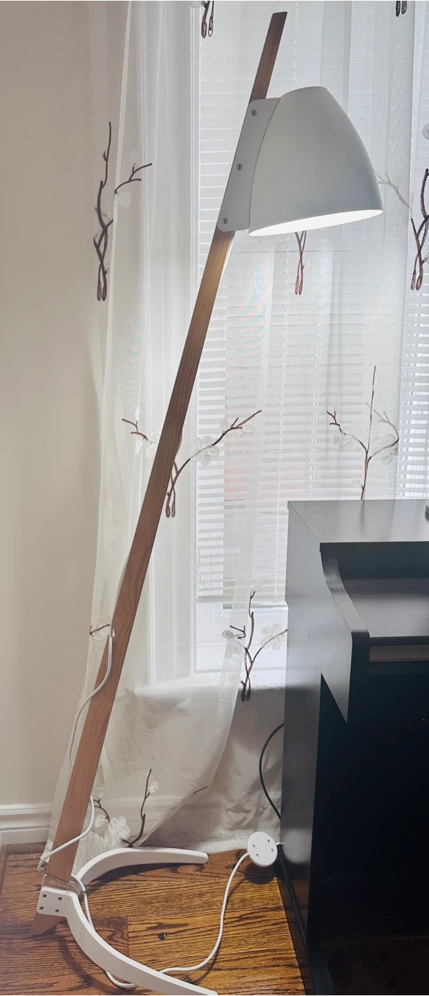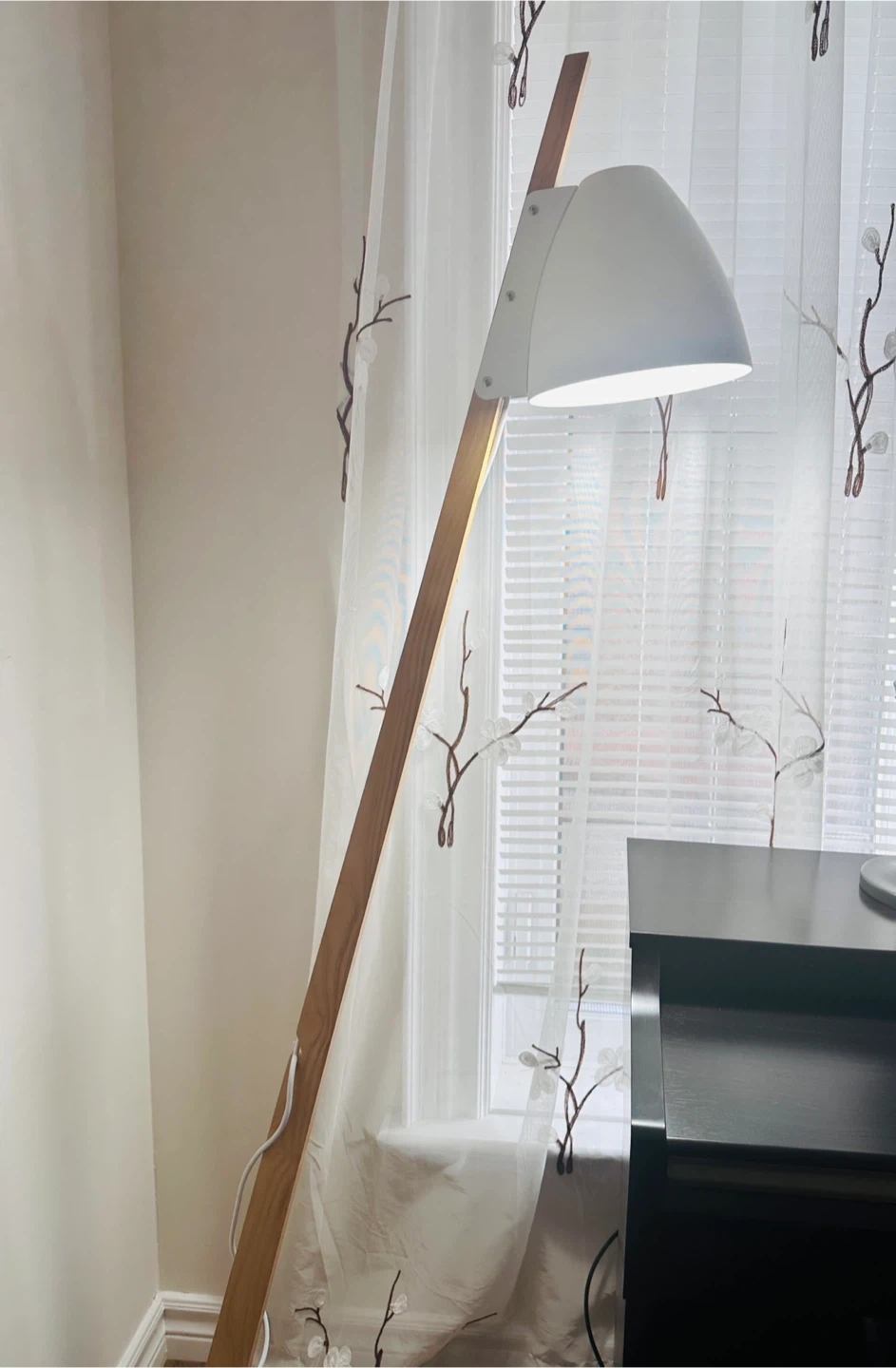 Selling an Ikea HOLMÖ floor lamp! It's in great condition and provides a nice, soft lighting. It has a modern look. Perfect for adding a cozy touch to any room. It has a wood-like frame with a white lamp shade. It has a Type G plug.