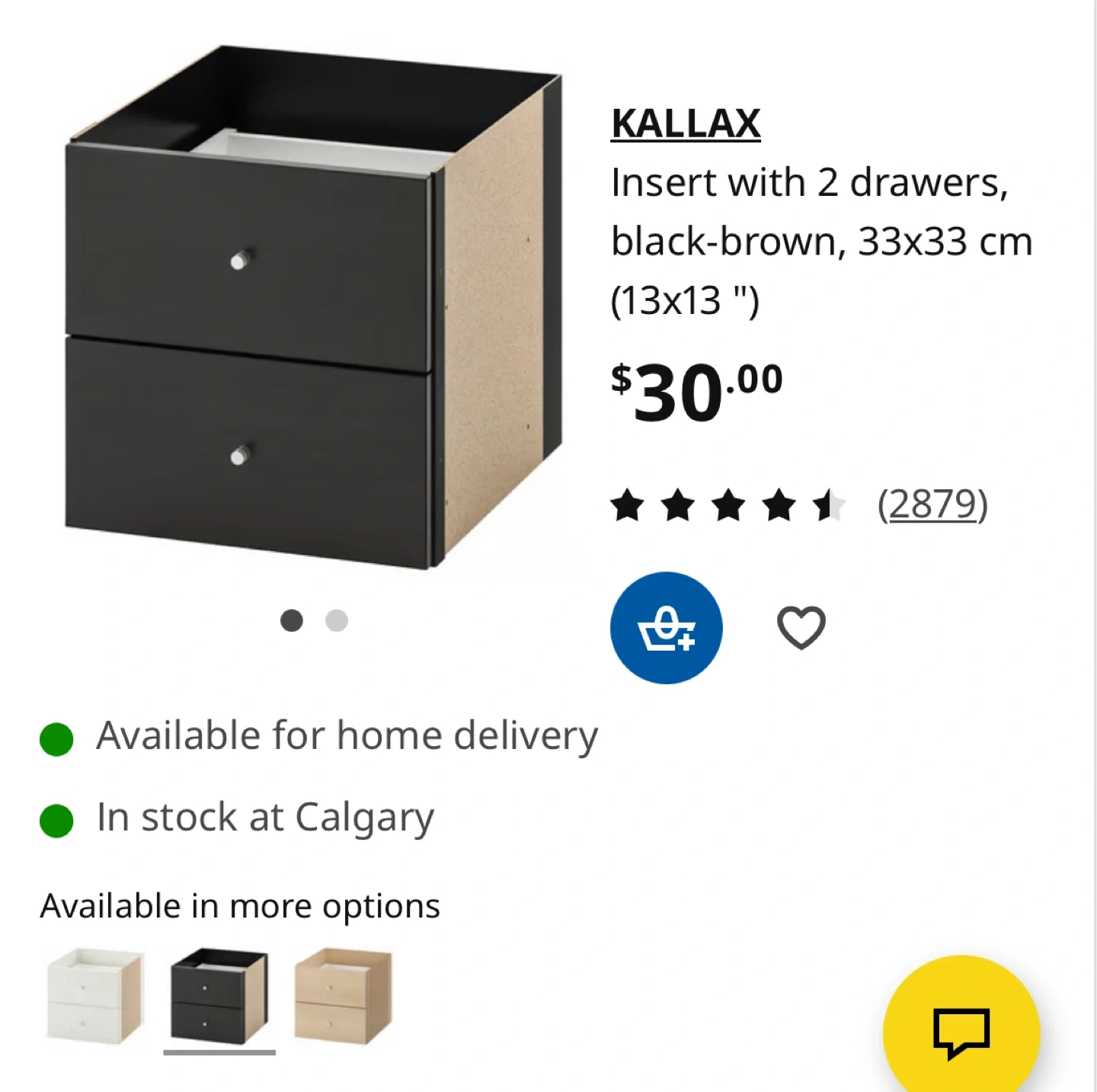 10Selling a brand new IKEA Kallax insert with two drawers! It's still in its original packaging, never opened. The insert is black-brown and measures 33x33 cm (13x13 inches). Originally bought for $30. Perfect for adding some extra storage to your Kallax shelf unit!