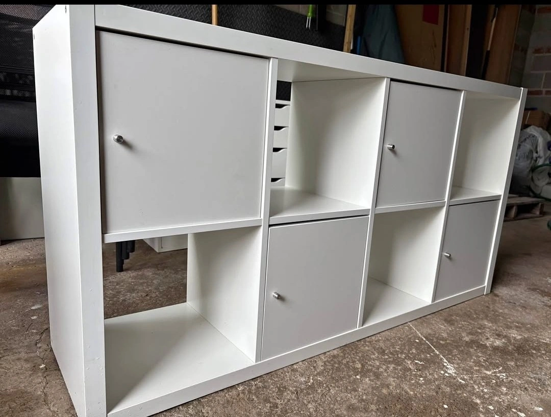 104Selling a white IKEA Kallax shelf unit! It's in great shape and ready to organize your space. Perfect for books, decor, or storage bins. It features a mix of open shelves and closed compartments with doors. original price llike $250