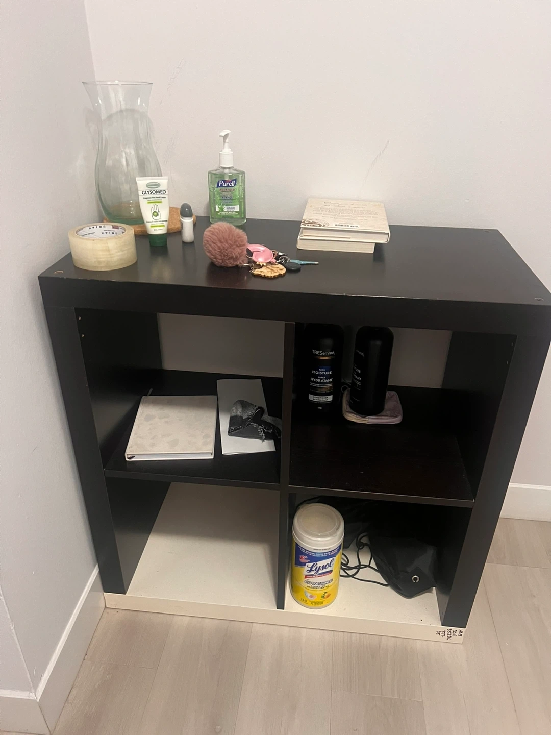 Selling an Ikea Kallax shelf unit in black-brown. It's in good condition and ready for a new home. Perfect for organizing books, decor, or anything you need to store. Great for small spaces. Need gone asap as moving out.