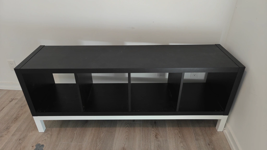 15Selling a black IKEA Kallax shelving unit with a white underframe. It's in great shape and ready for a new home! It's a versatile piece that can be used for storage or display. The dimensions are 147x59cm,. Originally bought for $109+tax